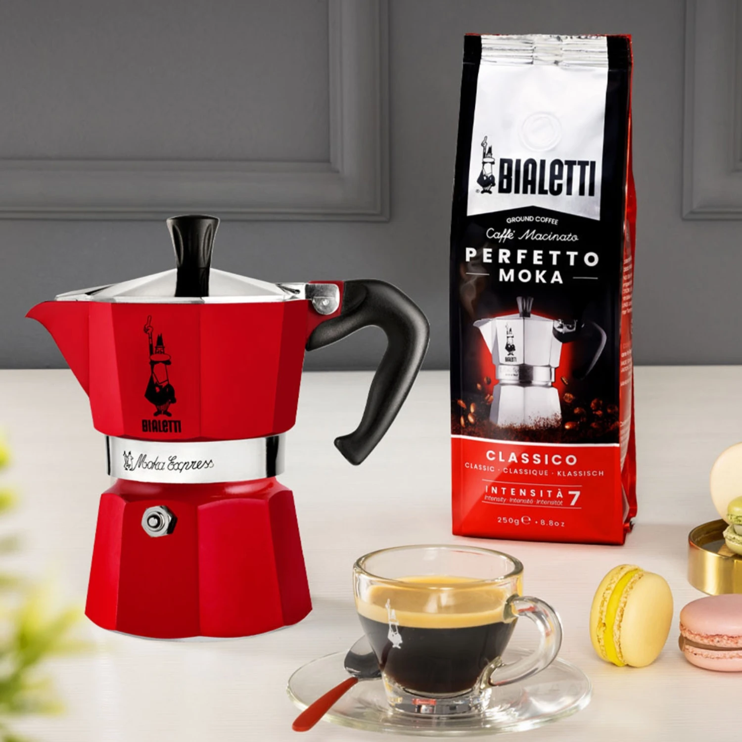 De felrode kleur is krasbestendig en jarenlang mooi, waardoor de percolator altijd aanwezig is in je keuken. Samen met de grijze accenten krijgt hij een luxe en moderne uitstraling. Het bekende Bialetti-logo met de kleine man met snor staat symbool voor kwaliteit en traditie. Het stevige nylon handvat en de dop worden minder snel heet en liggen prettig in de hand.