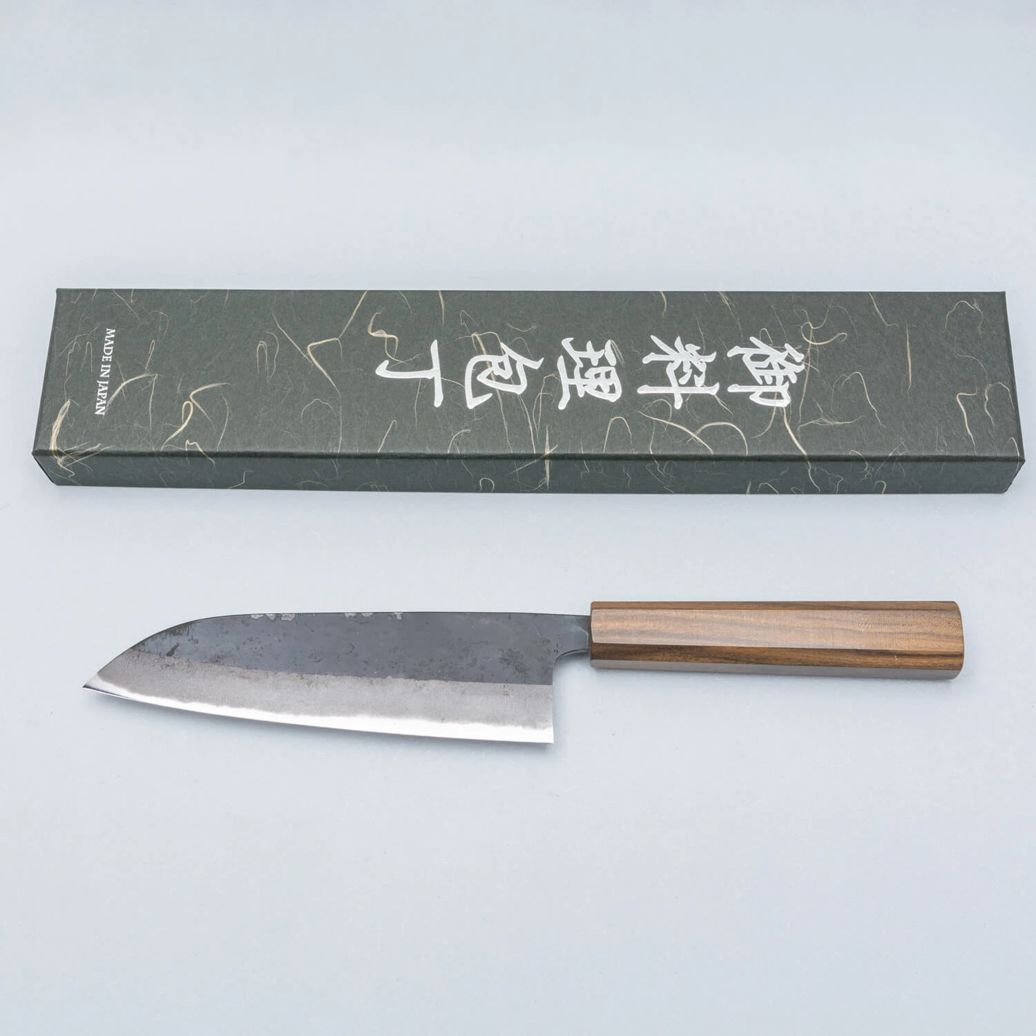 Preisgünstige Kohlenstoffmesser aus Tosa, Japan. Die Kokugei-Messer sind aus reinem Aogami #2 Kohlenstoffstahl gefertigt und haben ein dunkles Kurouchi-Finish. Die Klingen sehen rustikal aus, aber der Schnitt ist raffiniert. Der Griff ist aus einem einzigen Stück Bubina-Holz gefertigt. Geschmiedet von Kamimura san.