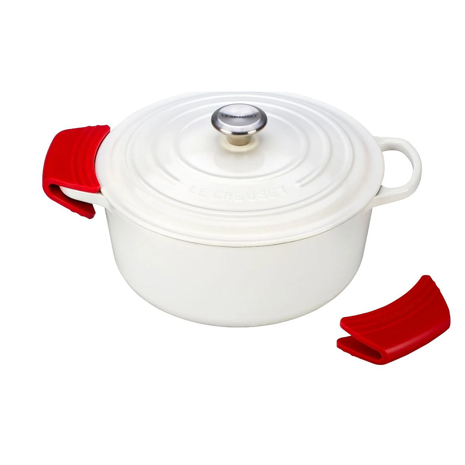 Die Griffe einer gusseisernen Bratpfanne können ziemlich heiß werden. Le Creuset bietet jetzt Griffe aus Silikon an, die Sie um die Pfanne legen können, sodass Sie nicht mehr mit Topflappen hantieren müssen. So können Sie die Bratpfanne sicher vom Herd auf den gedeckten Tisch heben.