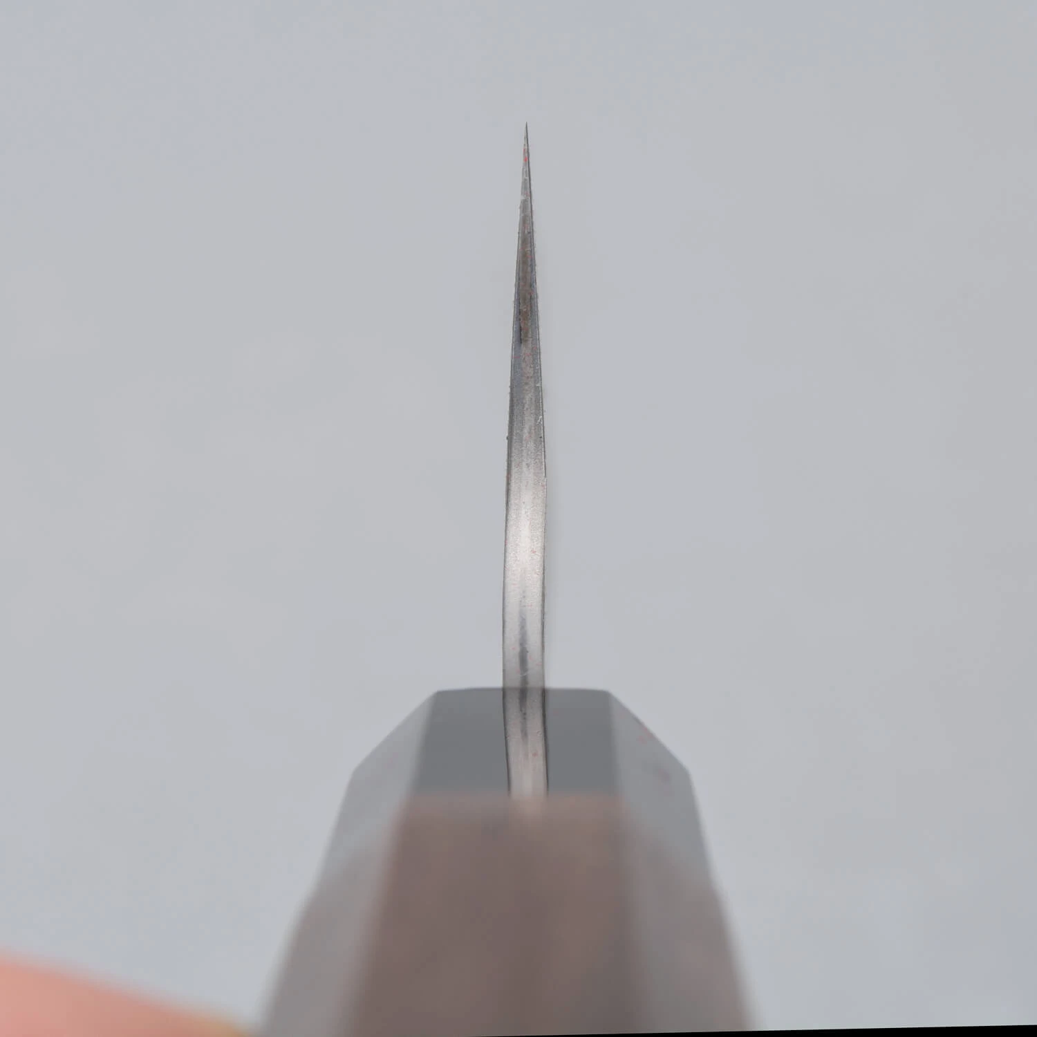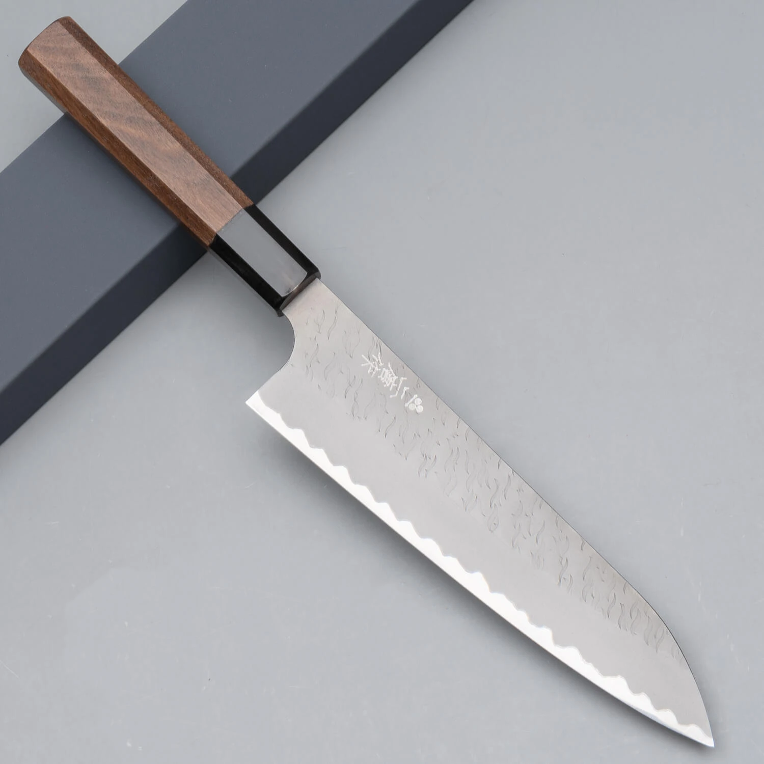 Das Messer hat einen Kern aus Aogami Super Carbon Stahl. Einer der feinsten Kohlenstoffstähle, der extrem scharf geschliffen werden kann. Mit einer Härte von 63 Rockwell bleibt dieses Messer auch besonders lange scharf. Der Kern wird durch 2 Schichten aus weicherem, rostfreiem Stahl mit dem speziellen Finish geschützt. Die Vertiefungen in den Schutzschichten sorgen dafür, dass die Lebensmittel beim Schneiden weniger haften bleiben.