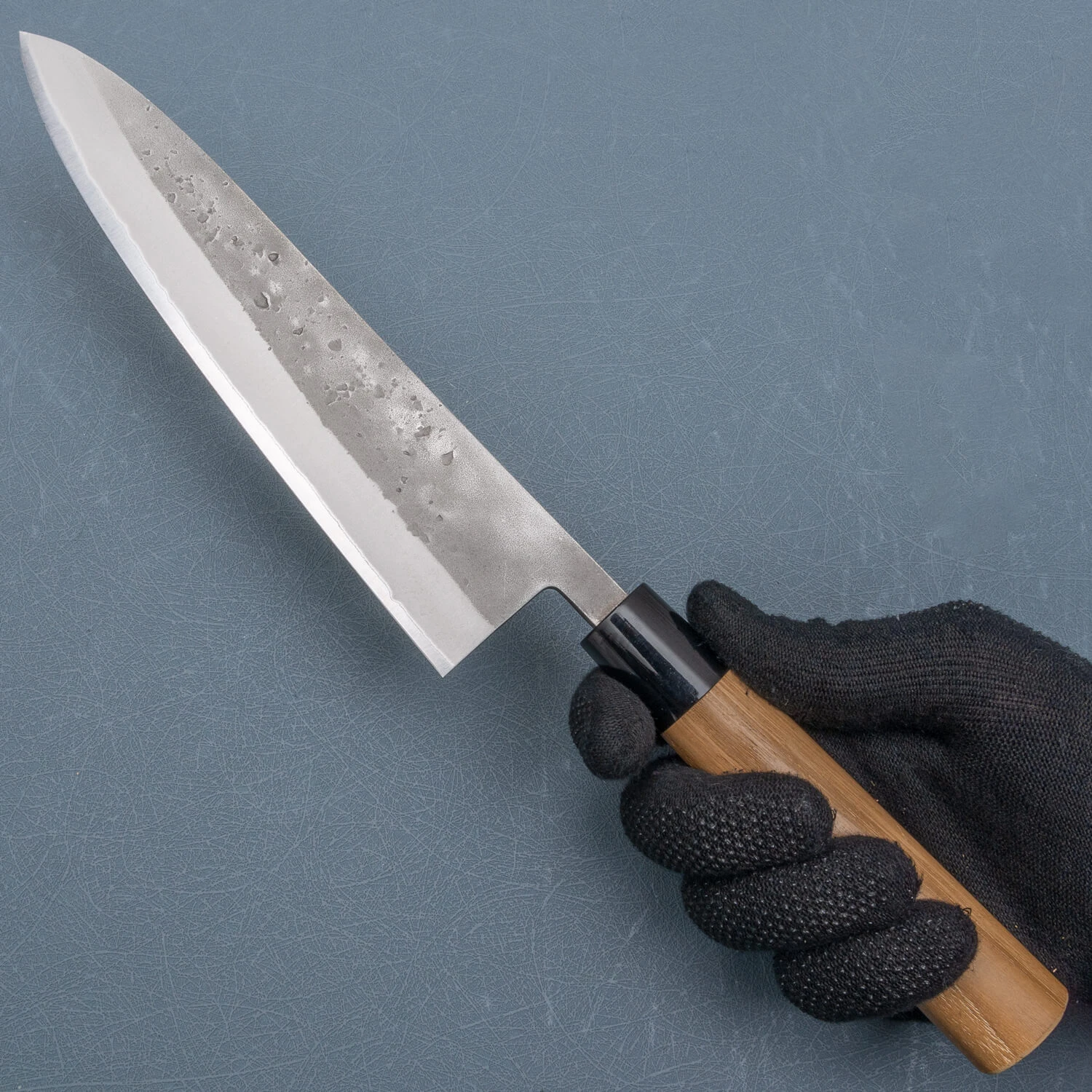 Der Stahl ist aus Aogami #2 Blue Paper Stahl. Dies ist ein Kohlenstoffstahl, mit dem japanische Schmiede gerne arbeiten. Er ist hart, bleibt lange scharf und ist leicht zu schärfen. Er kann nur rosten und verfärbt sich bei Gebrauch. Das ist ein Nachteil, aber diese Messer schneiden und schärfen viel feiner als rostfreie Messer.