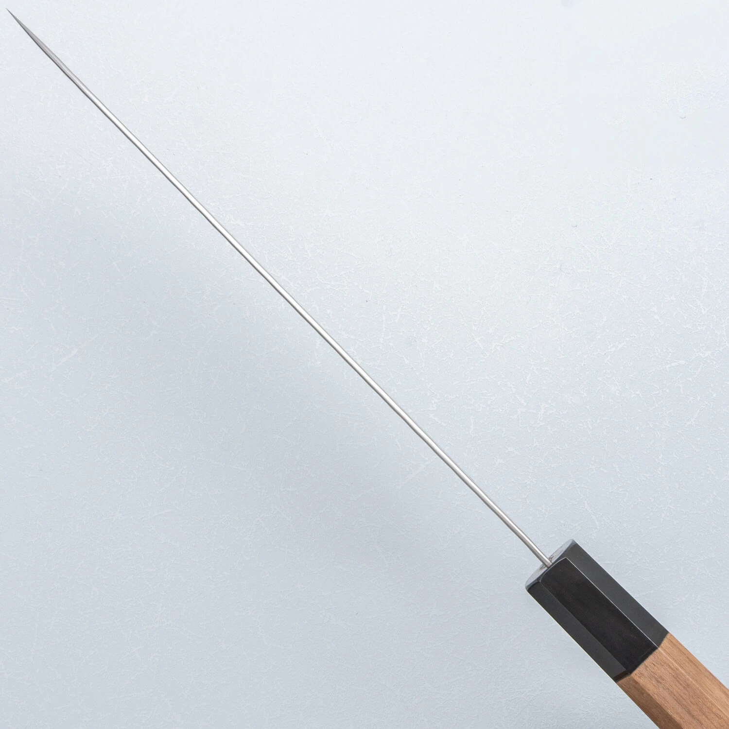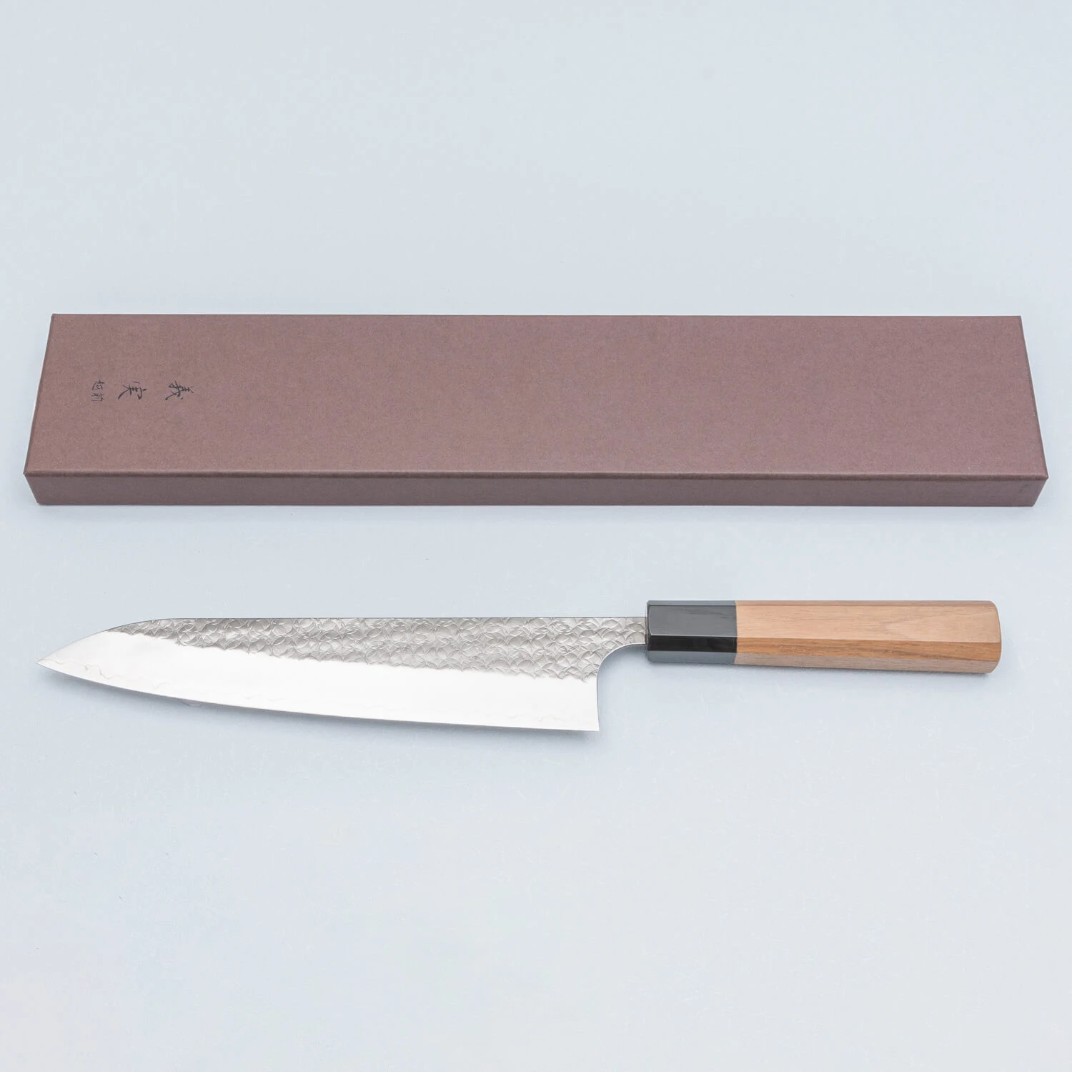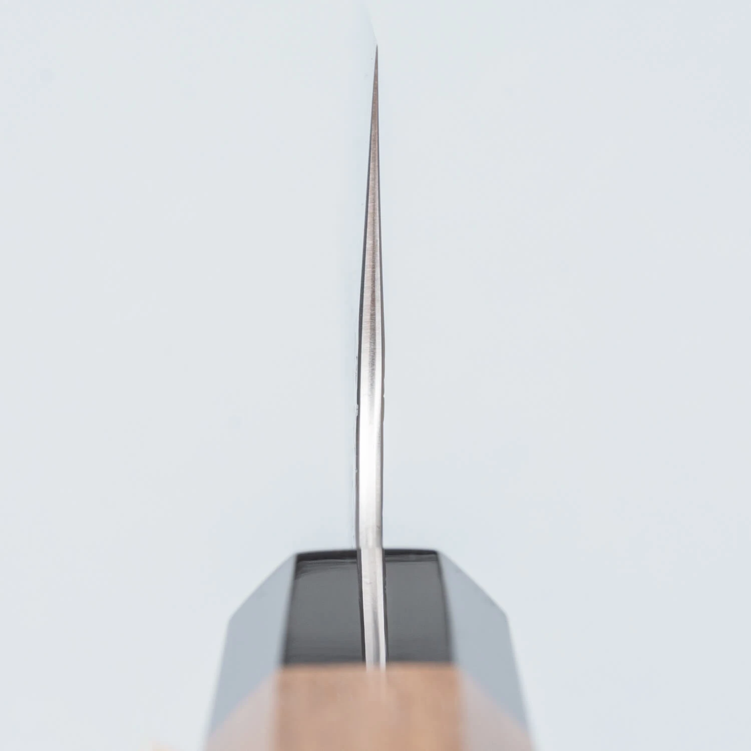 Diese schöne Gyuto wurde von Yoshimi Kato, dem Schwiegersohn von Hiroshi Kato, handgeschmiedet. Er war Lehrling bei Kanehiro und Hiroshi-San und hat so das Schmieden von den Besten gelernt. Neben den Messern, die er für Masakage herstellt, hat er auch seine eigenen Serien. Von diesen ist dies sicherlich die schönste Serie.