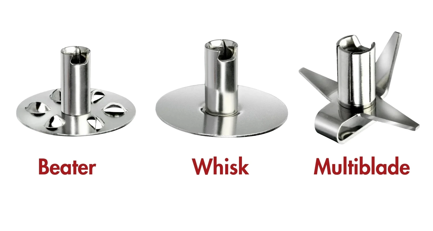 The beater is used for everything that needs to be fluffy. Think of whipped cream, egg whites, sabayon, mousse or a soft cake base. Its slight tilt and gentle upward motion will quickly give you a nice airy result. It is made of stainless steel, dishwasher safe and fits on any Bamix hand blender.