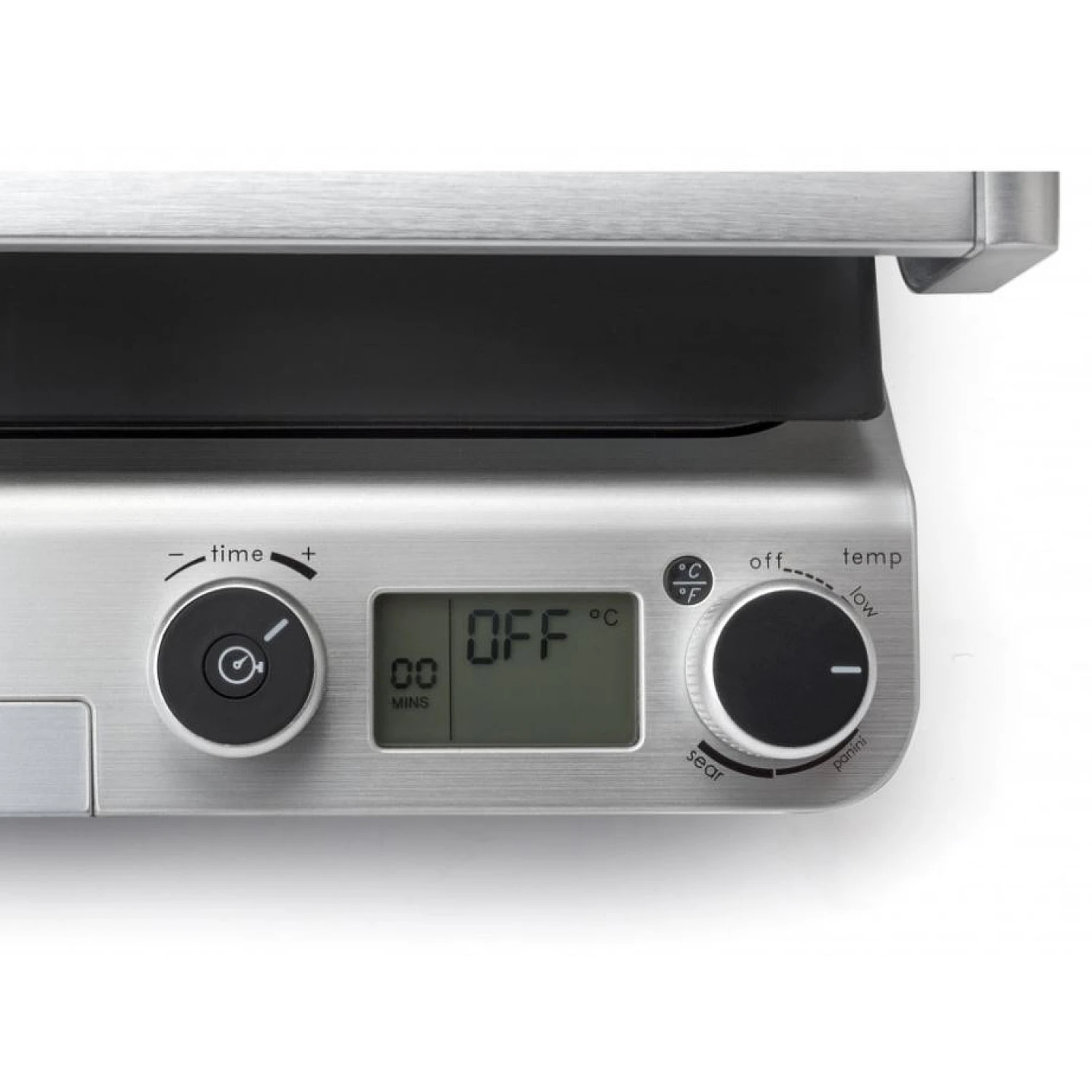 The grill has a clear LCD display and indicates the set temperatures. For example, Low (160-180°C) is the perfect temperature for delicate vegetables and fish. Sear (205-230°C), on the other hand, is good for roasting steaks and larger pieces of meat. You easily adjust the grill to that by adjusting the height on the side.