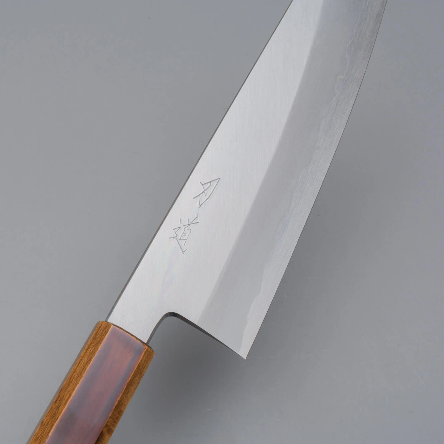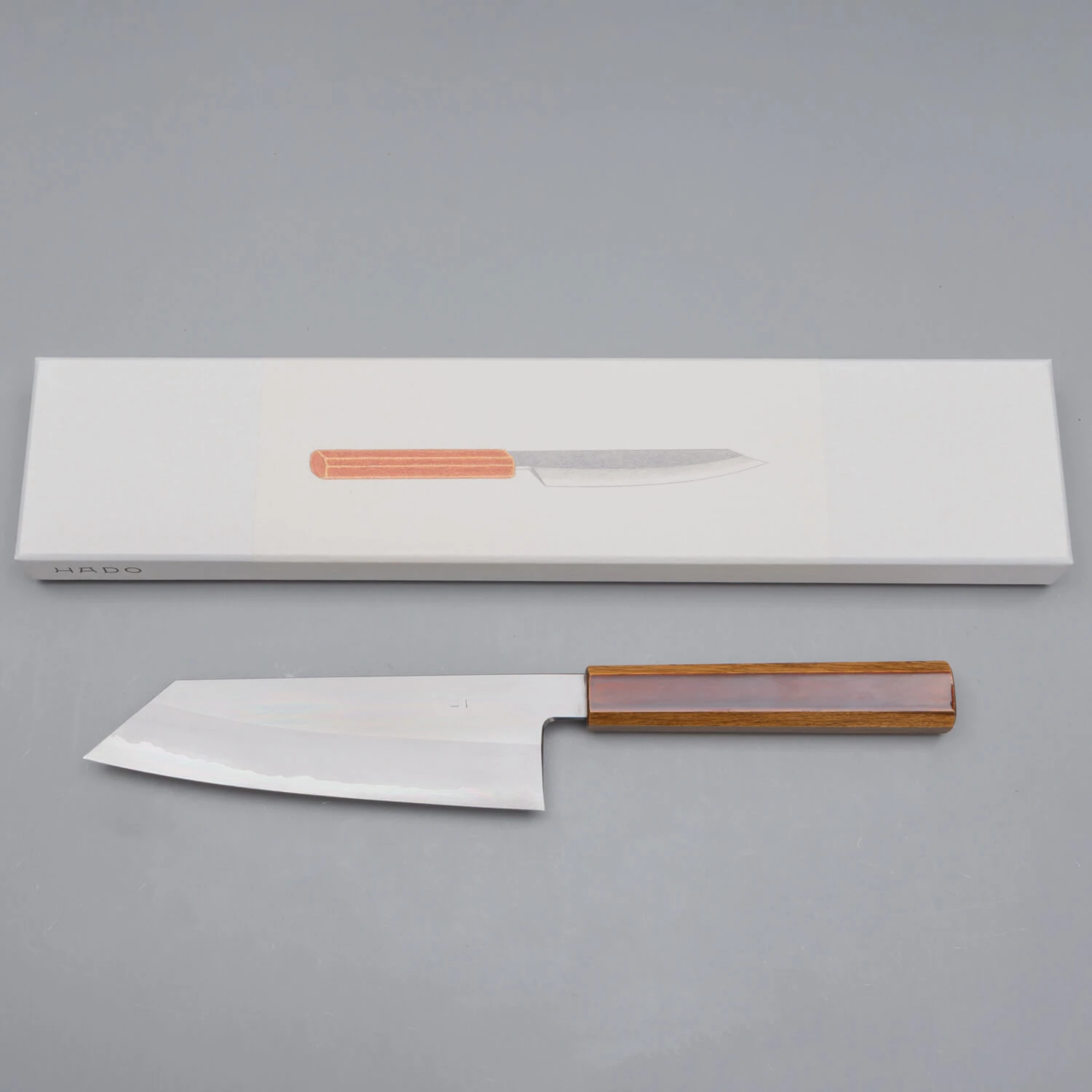 Hado Junpaku knives are made from the purest carbon steel grade, Shirogami #1. Also known as White Paper steel, this type of steel can be sharpened sharper than other types of steel. The purity of the steel also makes it easy to sharpen yourself. However, the steel is sensitive to acids and thus must be wiped regularly. The hard carbon core is protected by two layers of stainless steel folded over the shirogami steel. This combination of shiro #1 with stainless steel is quite rare. For this reason alone, Junpaku knives are highly recommended.