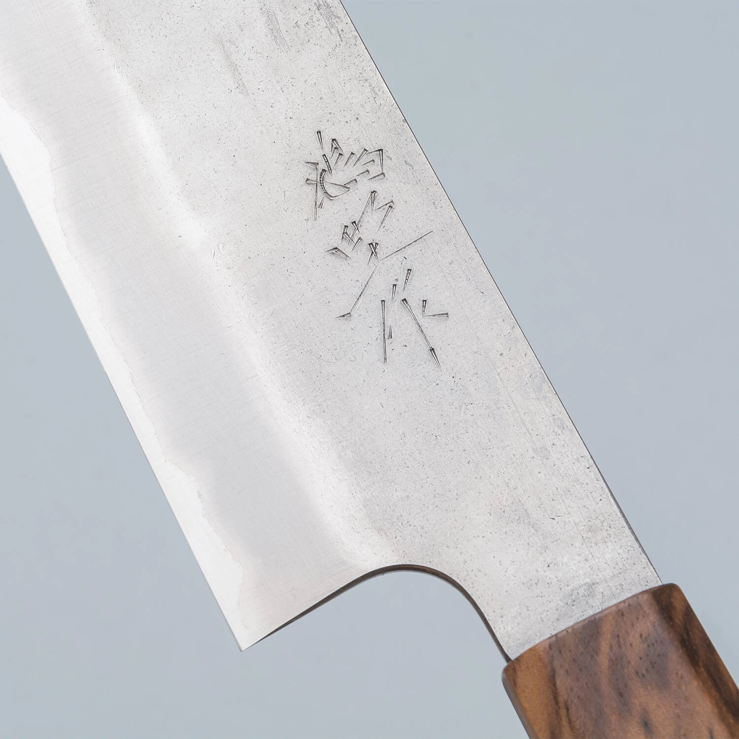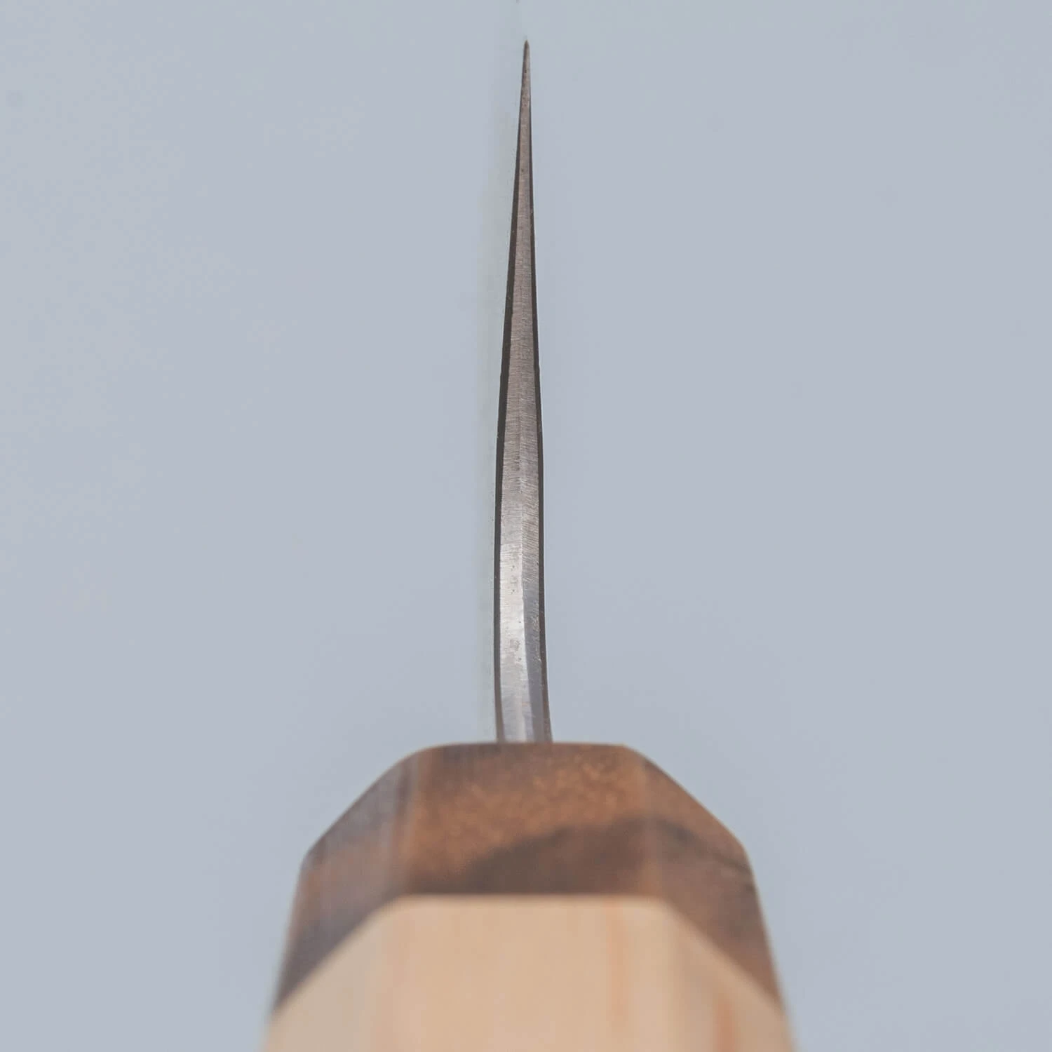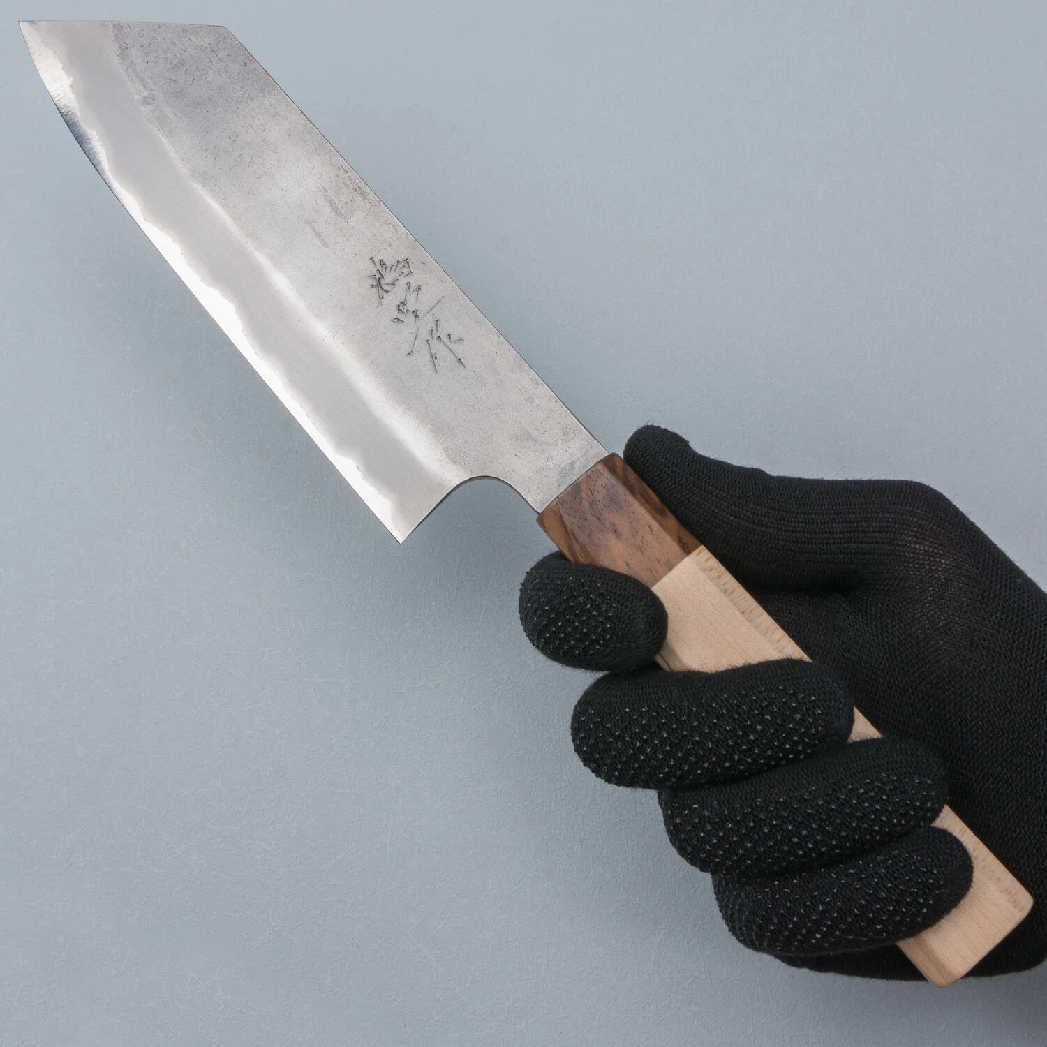 This fine-grain carbon knife is made from Japanese Shirogami steel. It sharpens better than any other steel, but requires careful drying after each use. Well-maintained, it surpasses any stainless steel knife in cutting finesse. A patina will form on the core steel, leading to discoloration, which also protects against rust.