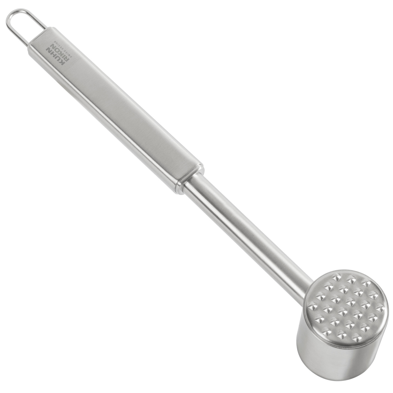 For crushing schnitzels or tenderizing meat: try the Kuhn Rikon meat mallet. This handy tool is ideal for evenly flattening schnitzels and tenderizing all kinds of meat. The meat mallet has a ribbed side specially designed to break up the fibers in the meat, making it more tender and juicy. Made of solid stainless steel, this meat tenderizer offers durability and a firm feel in the hand, ensuring optimal control during use.