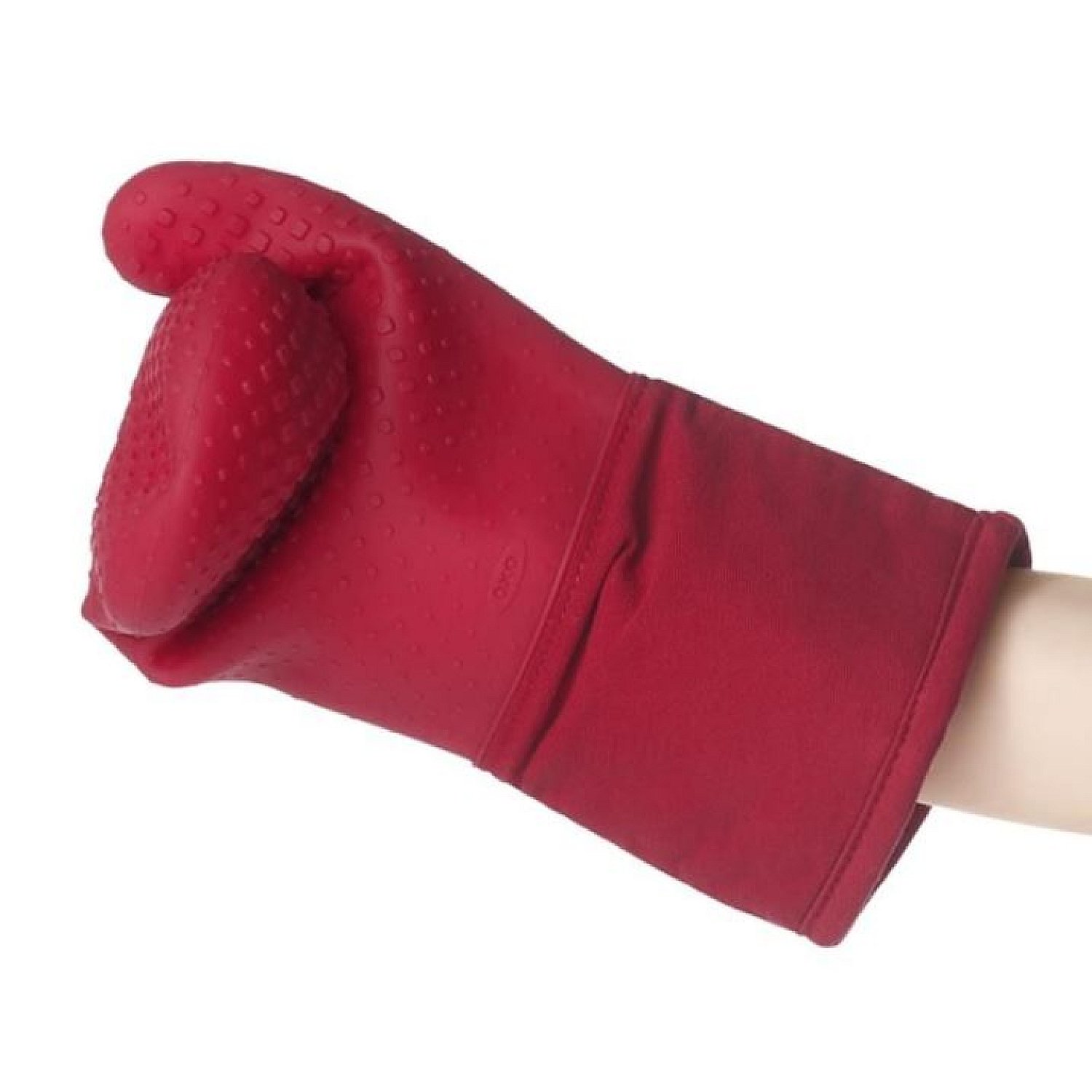 Your hand is optimally protected with this bright red oven mitt from OXO. This is because the grip of this mitt is made of silicone and suitable for temperatures up to 230°C. Thanks to the non-slip ridges, you have a good grip on oven dishes or baking trays.