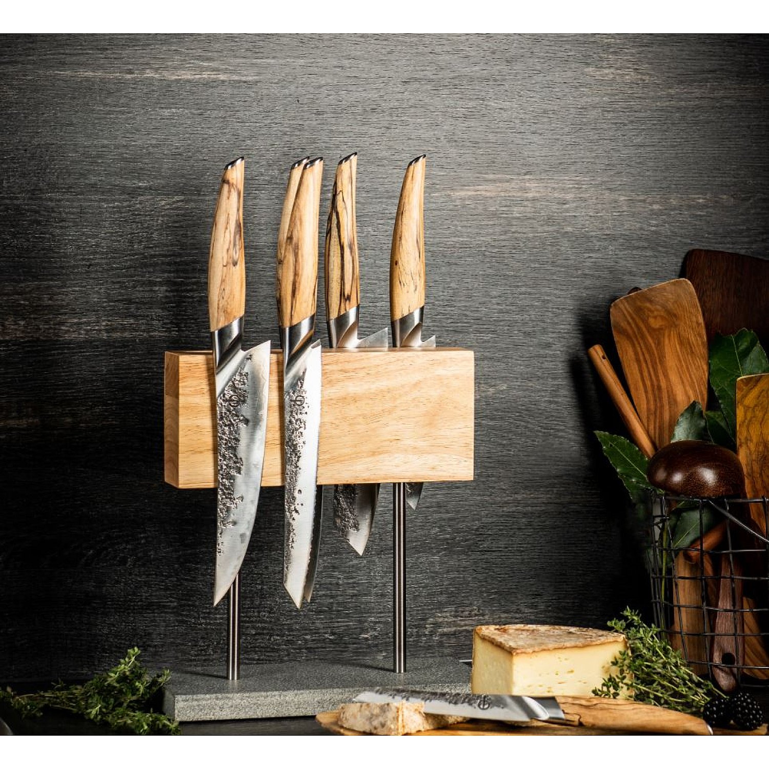 This knife block is a picture to behold. The artful knife block is made of light oak containing a sturdy magnet. The base is made of natural stone. This block comes with 4 legs, 2 black and 2 silver. So you can change the legs according to your taste.