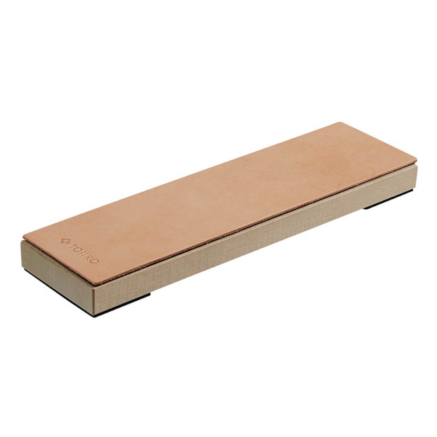 The Tojiro Strop removes micro burrs from your sharpened knives. This makes it even sharper and the knife cuts smoother. The leather is glued to the holder, so you can use it as a sharpening stone. The holder has non-slip feet so it stays put while polishing.
