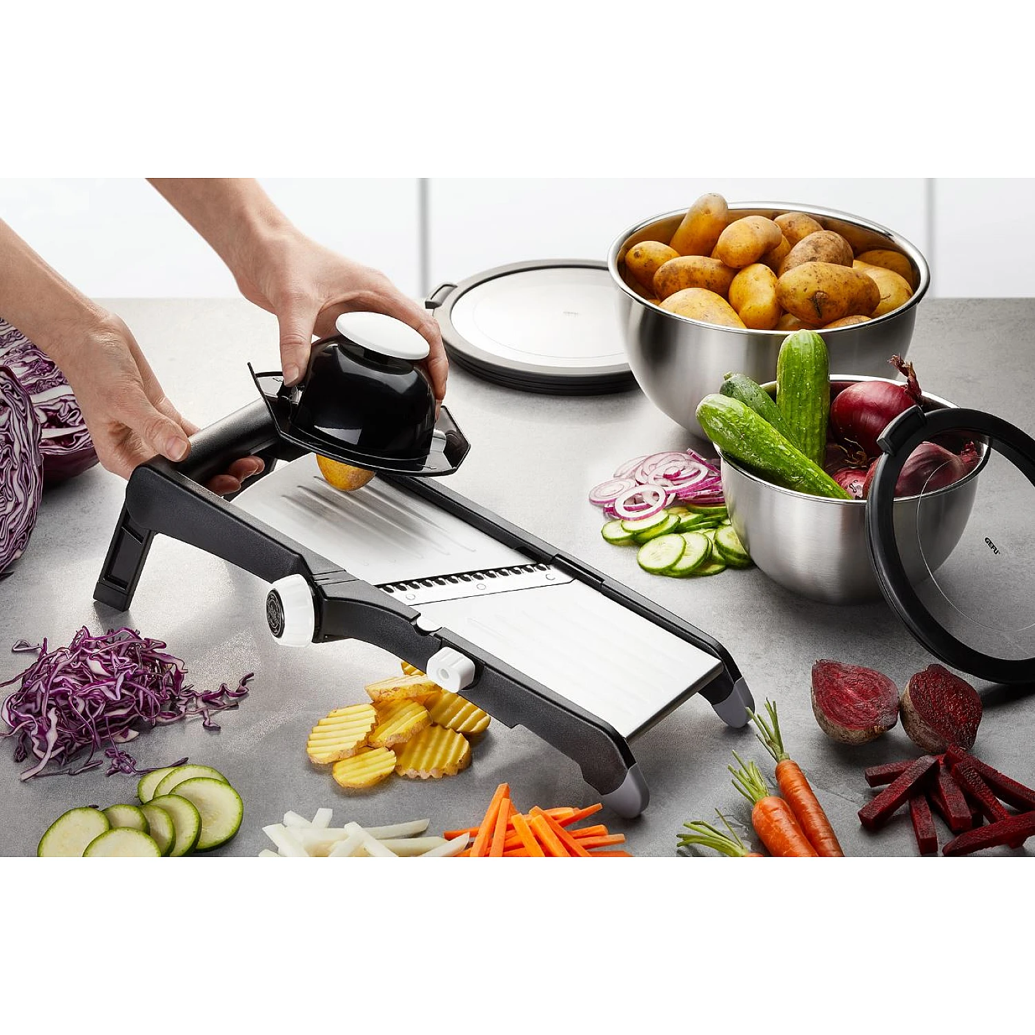 Gebruik de schijfjes en reepjes als garnering voor een salade. Of geef de kinderen gegolfde plakjes aardappel tijdens het warm eten. Met deze mandoline kun je echt alle kanten op.