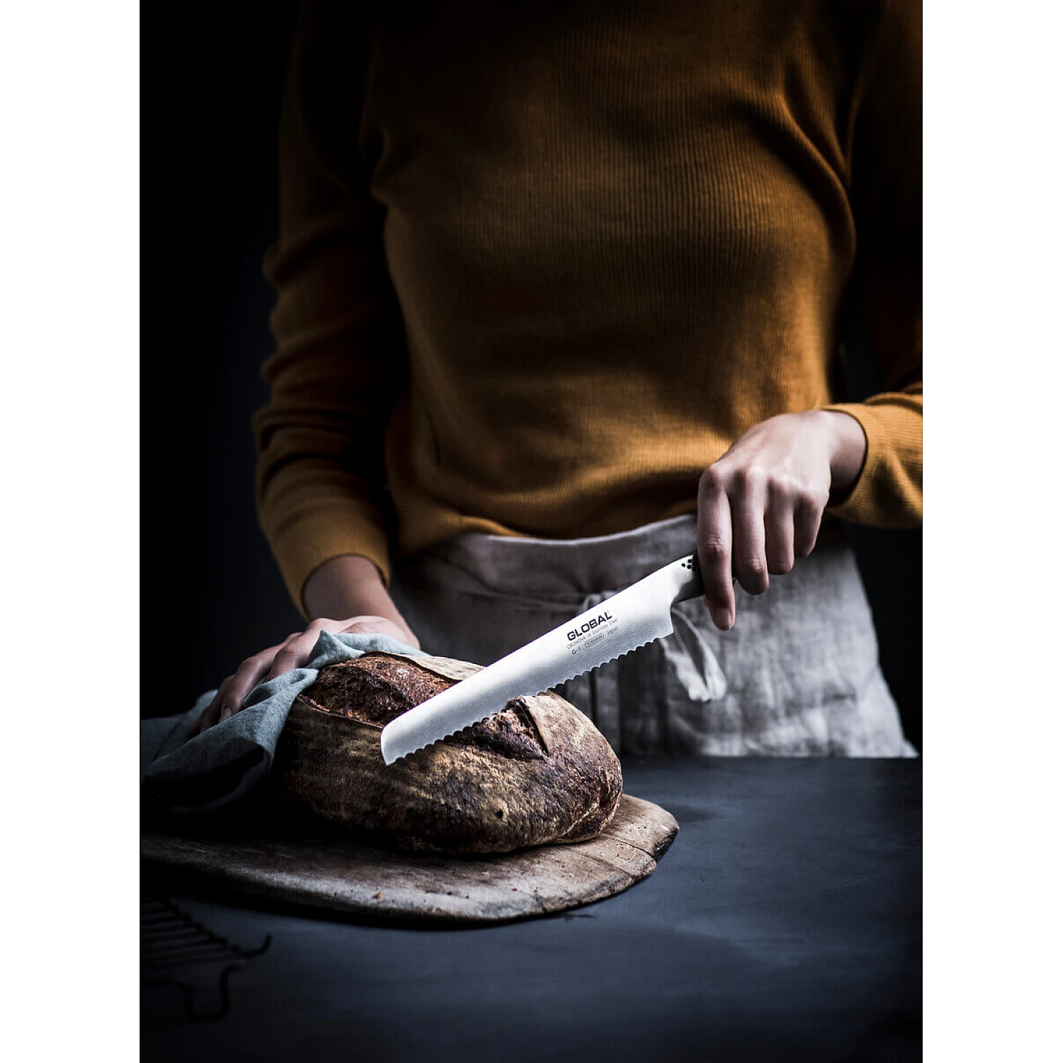 Dit Global broodmes is wat betreft de vormgeving gelijk aan het Global roastmes (G-8), maar dan met kartels. Dit Global kartelmes is veelzijdig te gebruiken want behalve voor brood is het ook voor een krop sla of andere kwetsbare producten te gebruiken. Het broodmes van Global heeft een lemmetlengte van 22cm en een totale lengte van 35cm.