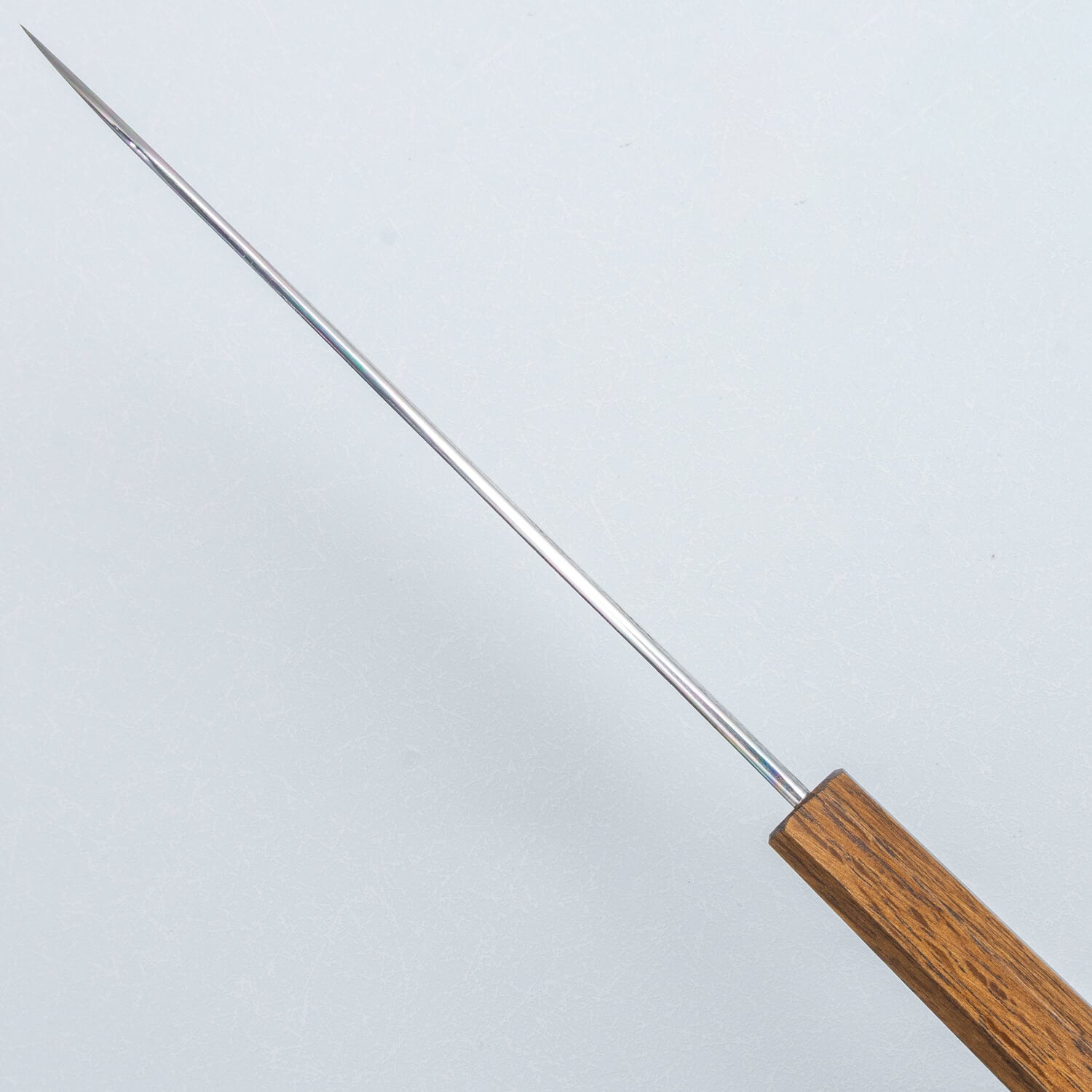 Dit mes is gemaakt van Japans Aogami #1 staal, een koolstofstaal dat gemakkelijk te slijpen en te onderhouden is. Het moet na elk gebruik grondig worden gedroogd voor een lange levensduur. Goed onderhouden snijdt het fijner dan elk roestvrijstalen mes. Je kunt een patinalaag opmerken die zich vormt op het kernstaal, wat leidt tot verkleuring, die gelukkig tegen roest beschermt.