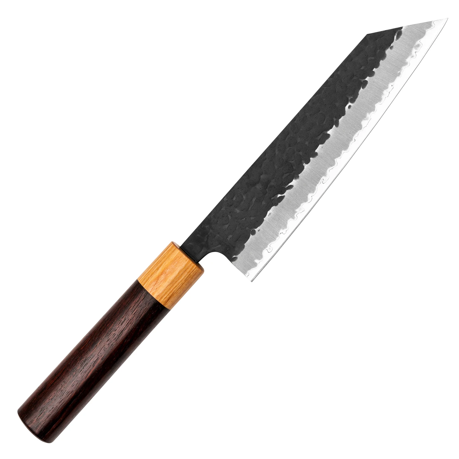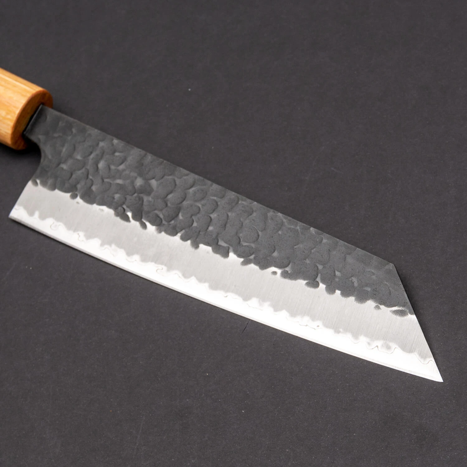 Het harde staal wordt beschermd door 2 lagen roestvrij staal met een kurouchi afwerking. Dit is de zwarte smeedhuid. Hierdoor is het mes minder gevoelig voor vallen en stoten en zal het minder snel roesten. Het mes is afgewerkt met een tsuchime (hamerslag) waardoor voedsel minder blijft plakken.