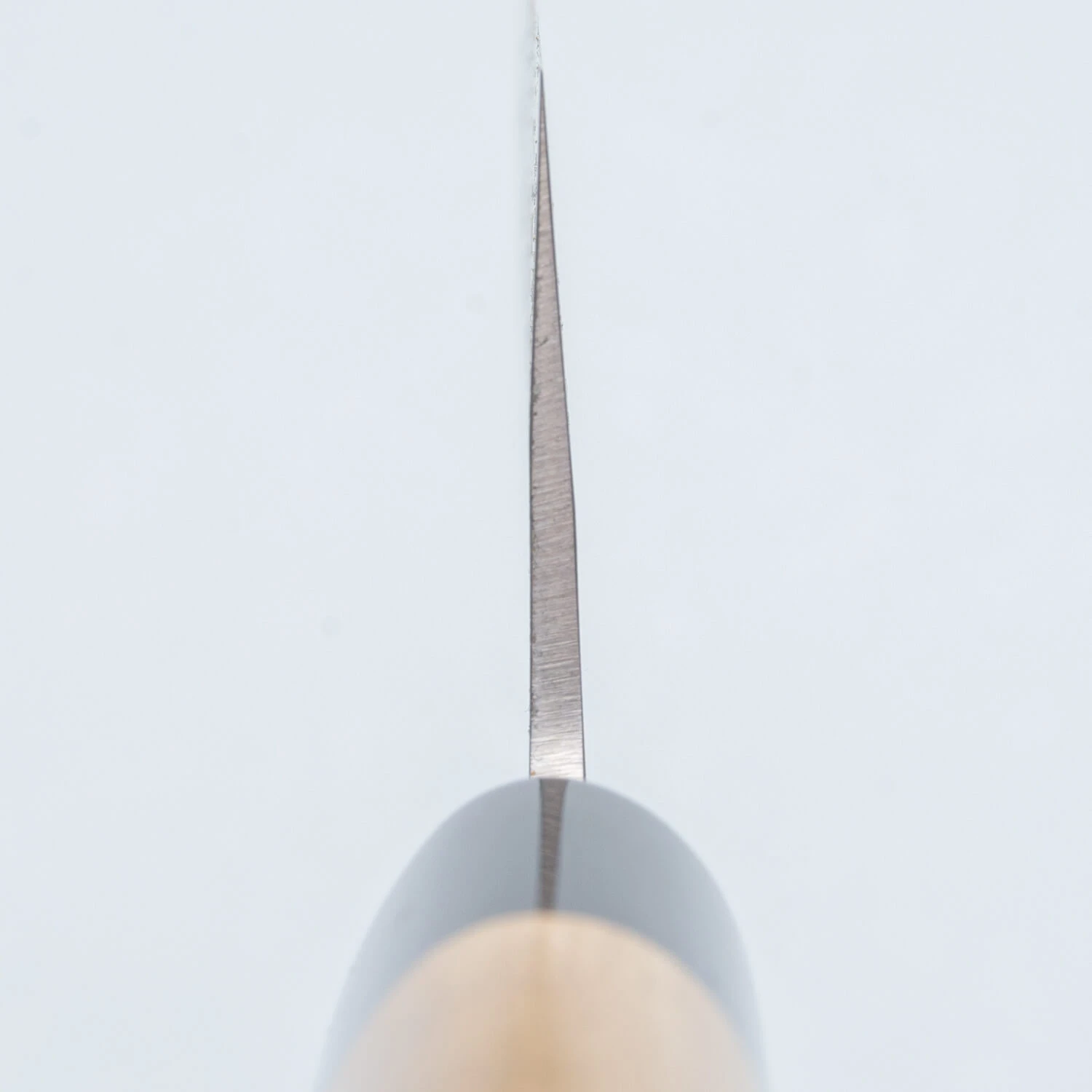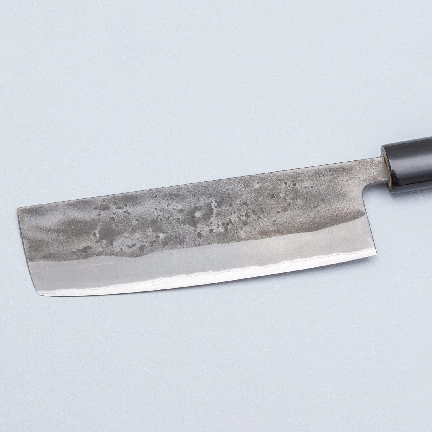 Dit mes is gemaakt van Japans Aogami #2 staal, een koolstofstaal dat gemakkelijk te slijpen en te onderhouden is. Het moet na elk gebruik grondig worden gedroogd voor een lange levensduur. Goed onderhouden snijdt het fijner dan elk roestvrijstalen mes. Je kunt een patinalaag opmerken die zich vormt op het kernstaal, wat leidt tot verkleuring, die gelukkig tegen roest beschermt.