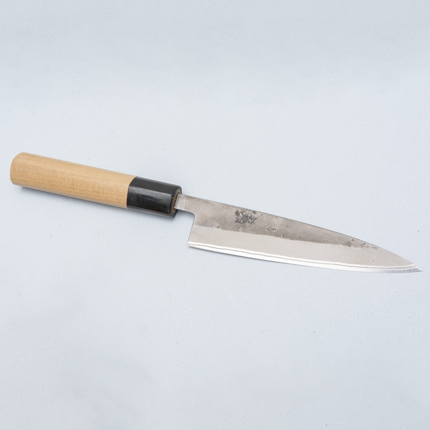 Dit mes is gemaakt van Japans Aogami #2 staal, een koolstofstaal dat gemakkelijk te slijpen en te onderhouden is. Het moet na elk gebruik grondig worden gedroogd voor een lange levensduur. Goed onderhouden snijdt het fijner dan elk roestvrijstalen mes. Je kunt een patinalaag opmerken die zich vormt op het kernstaal, wat leidt tot verkleuring, die gelukkig tegen roest beschermt.