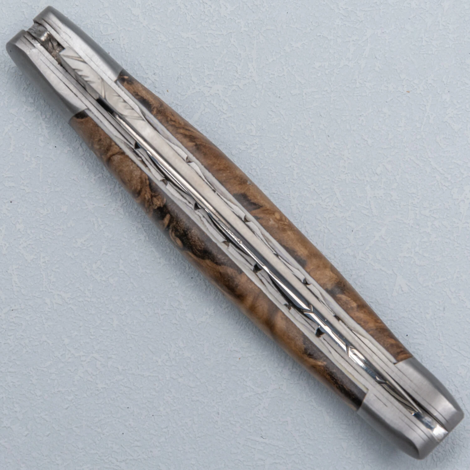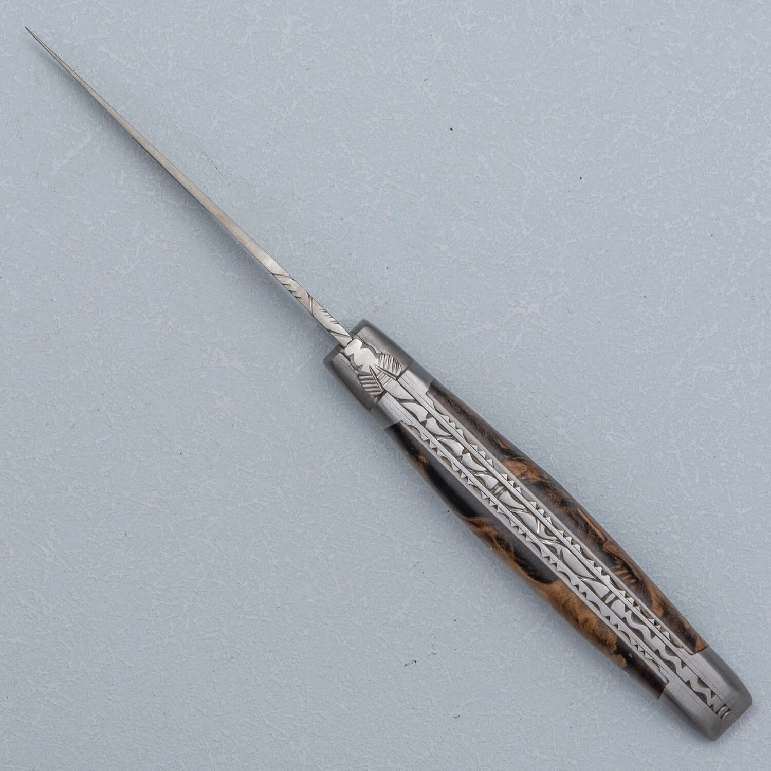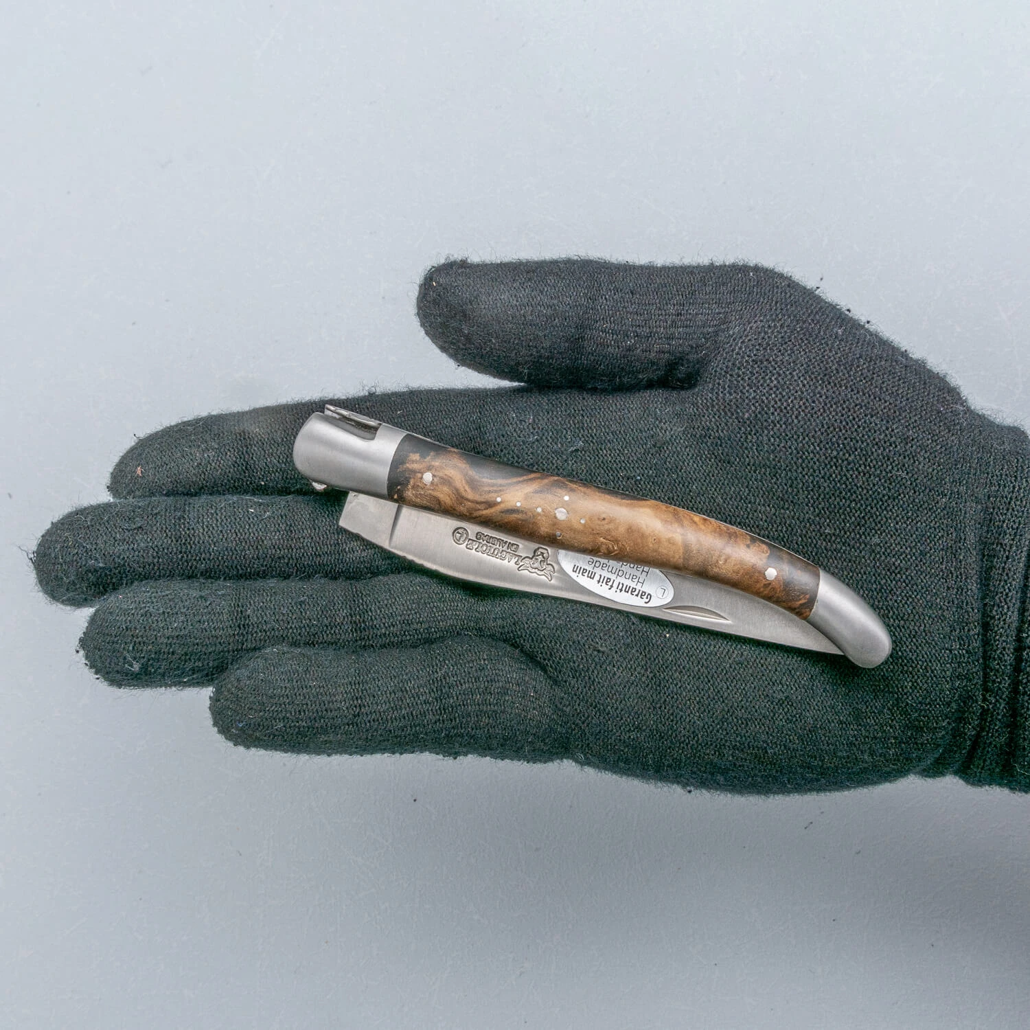 De zakmessen van Laguiole en Aubrac zijn stuk voor stuk kunstwerkjes. Elk mes wordt volledig met de hand gemaakt, geslepen en gegraveerd door dezelfde persoon. Elk van de 14 messenmakers hebben hun eigen kenmerk die ze graveren op de bovenkant van het lemmet en in de rug van het handvat. Bij dit exemplaar zit er een dubbele gravure in het handvat wat er zeer bijzonder uitziet.