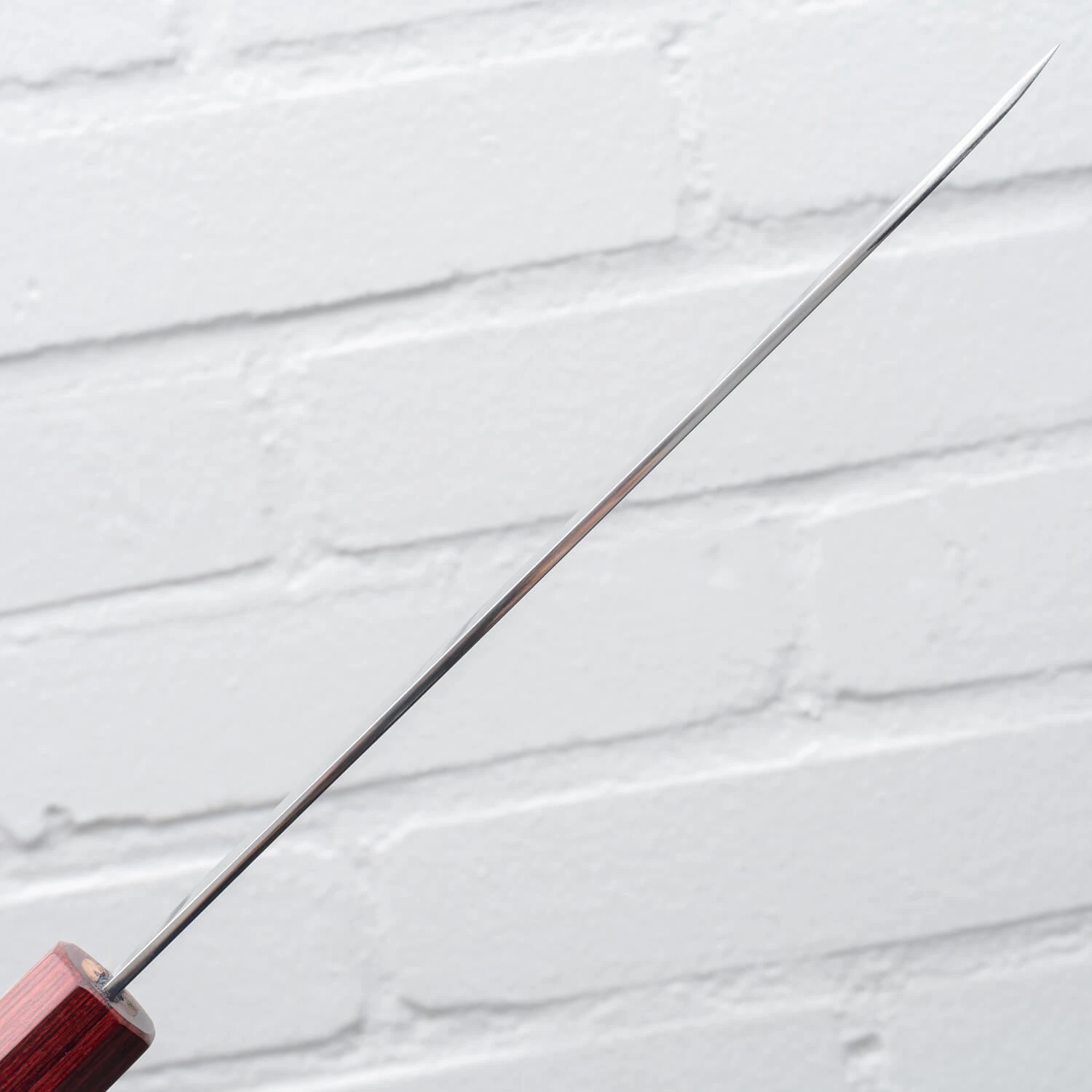 Het mes heeft een strak design zonder damast. Het handvat is gemaakt van esdoorn hout met een rode pakkahouten krop.