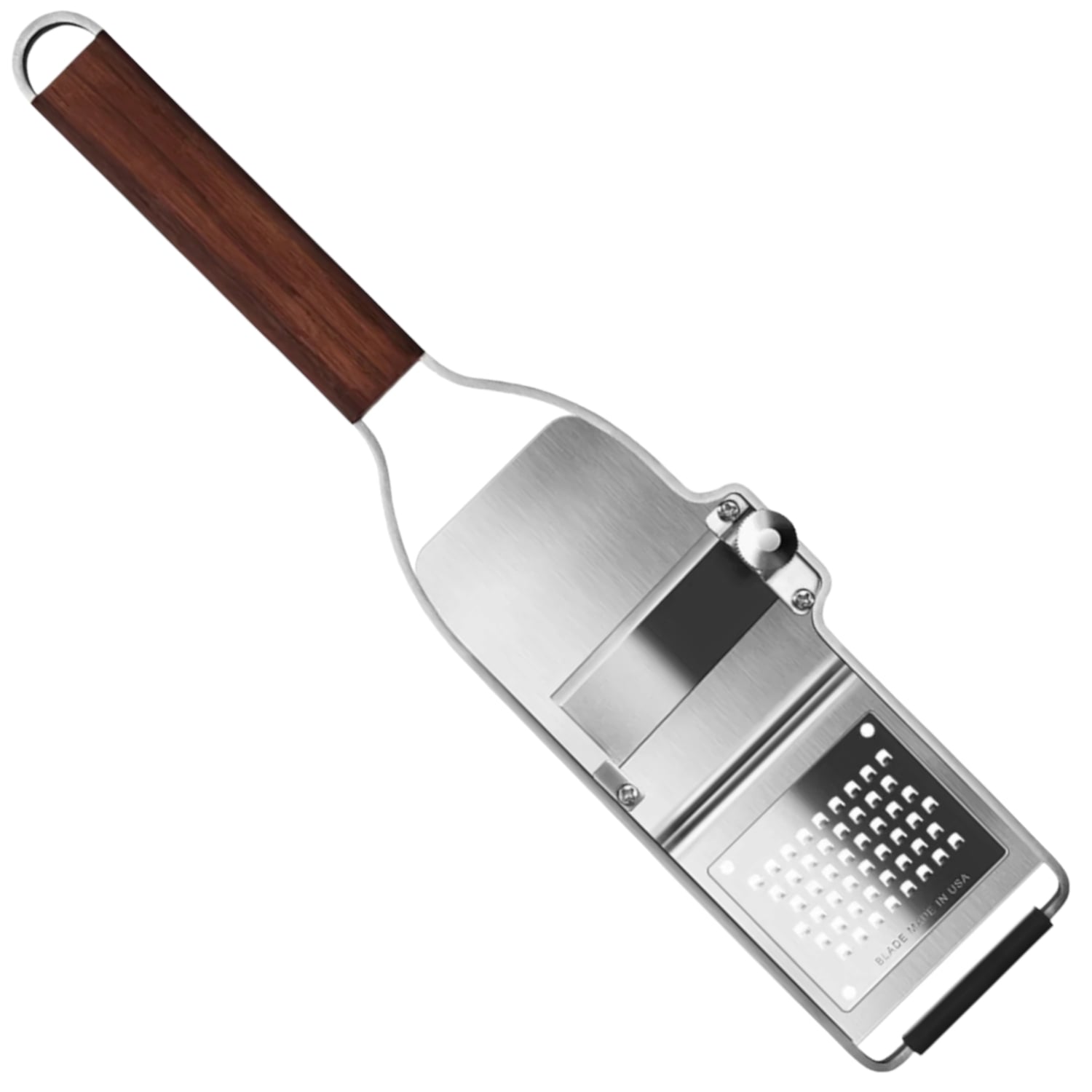 De Microplane Master Truffle Tool combineert een rasp en een schaaf in één stijlvol keukeninstrument. Dankzij het vlijmscherpe roestvrijstalen blad kun je zowel fijne rasp als gelijkmatige plakjes maken. Met het handige instelwiel bepaal je zelf de dikte van de schaaf, zodat elk plakje truffel, kaas of chocolade precies naar wens wordt.