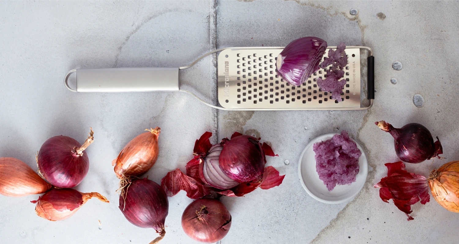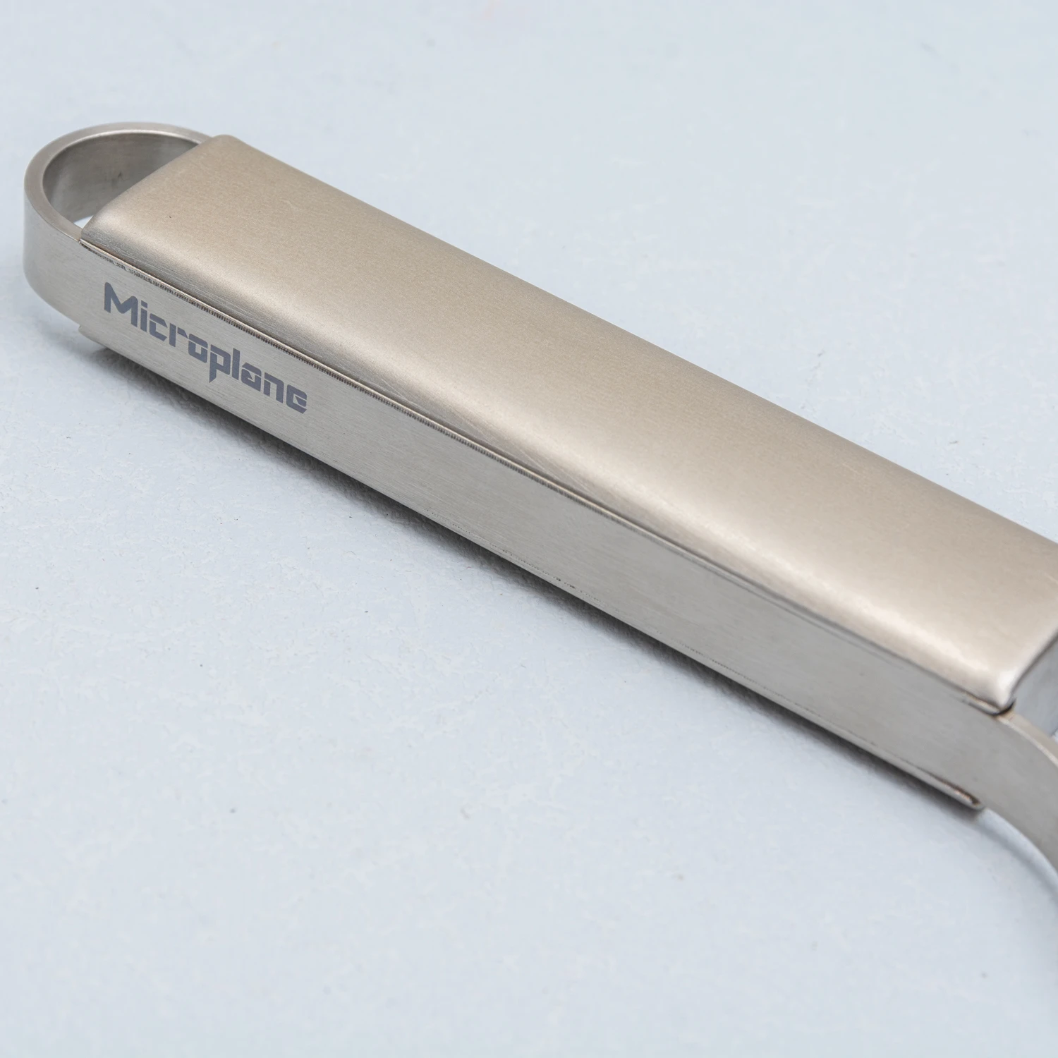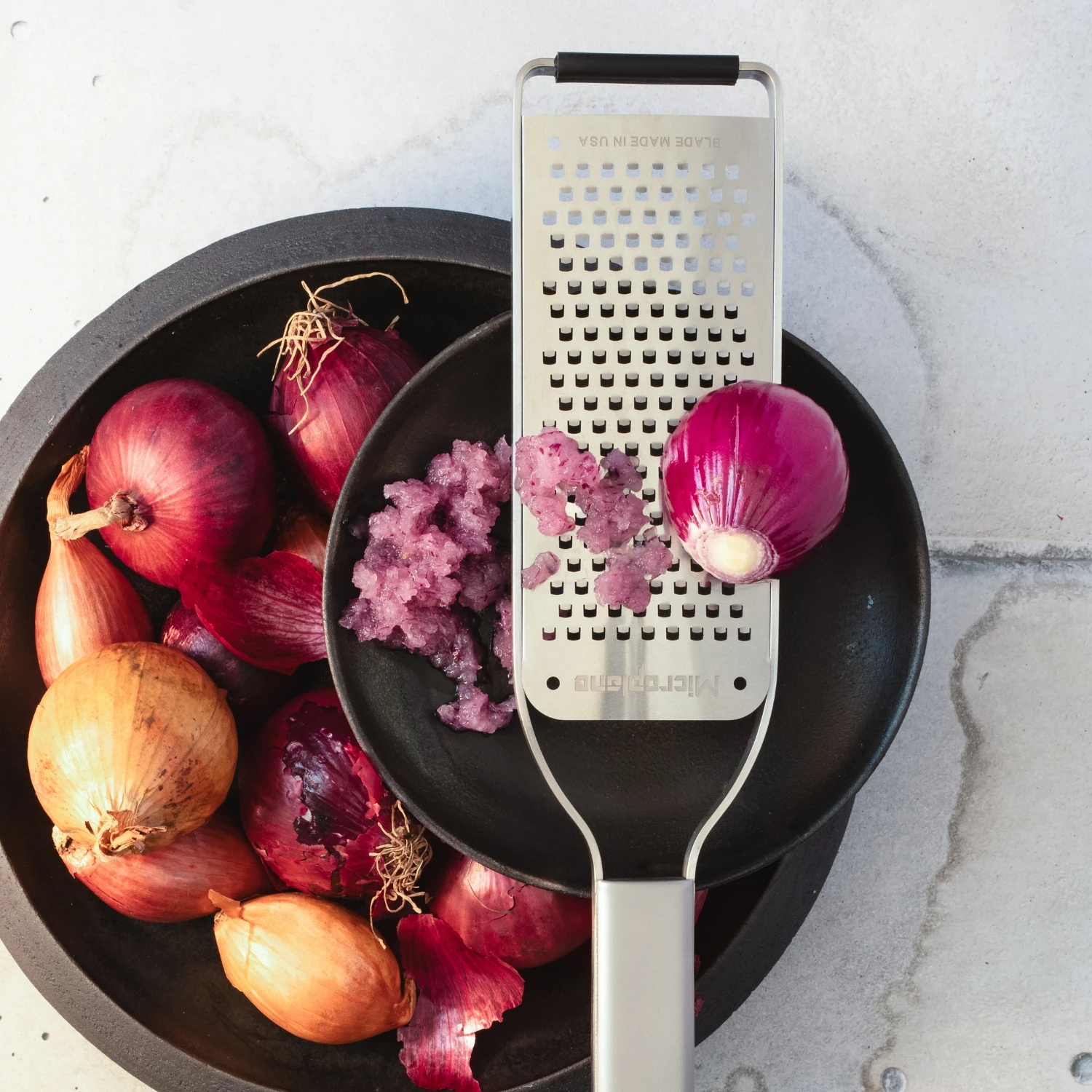 De grove Microplane rasp is ideaal wanneer je wat meer structuur en bite in je gerechten wilt. In tegenstelling tot de fijne rasp, die luchtige en fluweelzachte vlokken oplevert, zorgt de grove rasp voor robuustere stukjes. Perfect voor een royale laag Parmezaanse kaas op een pasta, grove chocoladeschilfers op een dessert of knapperige wortel en appel door een salade. Dankzij de vlijmscherpe snede werk je snel en zonder moeite, zelfs bij grotere hoeveelheden.