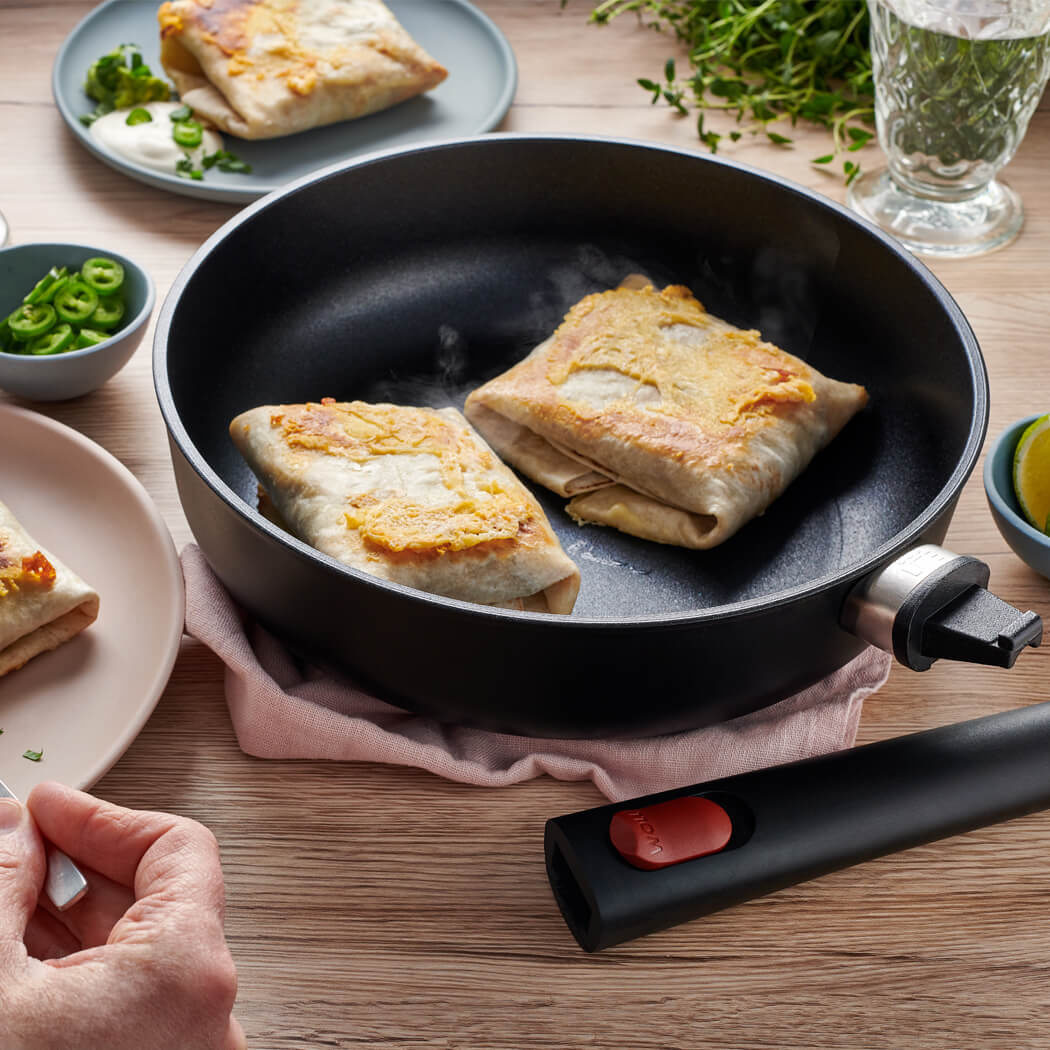 Met de afneembare handgreep kun je de koekenpan op het fornuis verwarmen, de handgreep verwijderen en de pan in de oven zetten om verder te koken. Of verwijder het handvat voor het opbergen, zodat de pan minder ruimte inneemt.