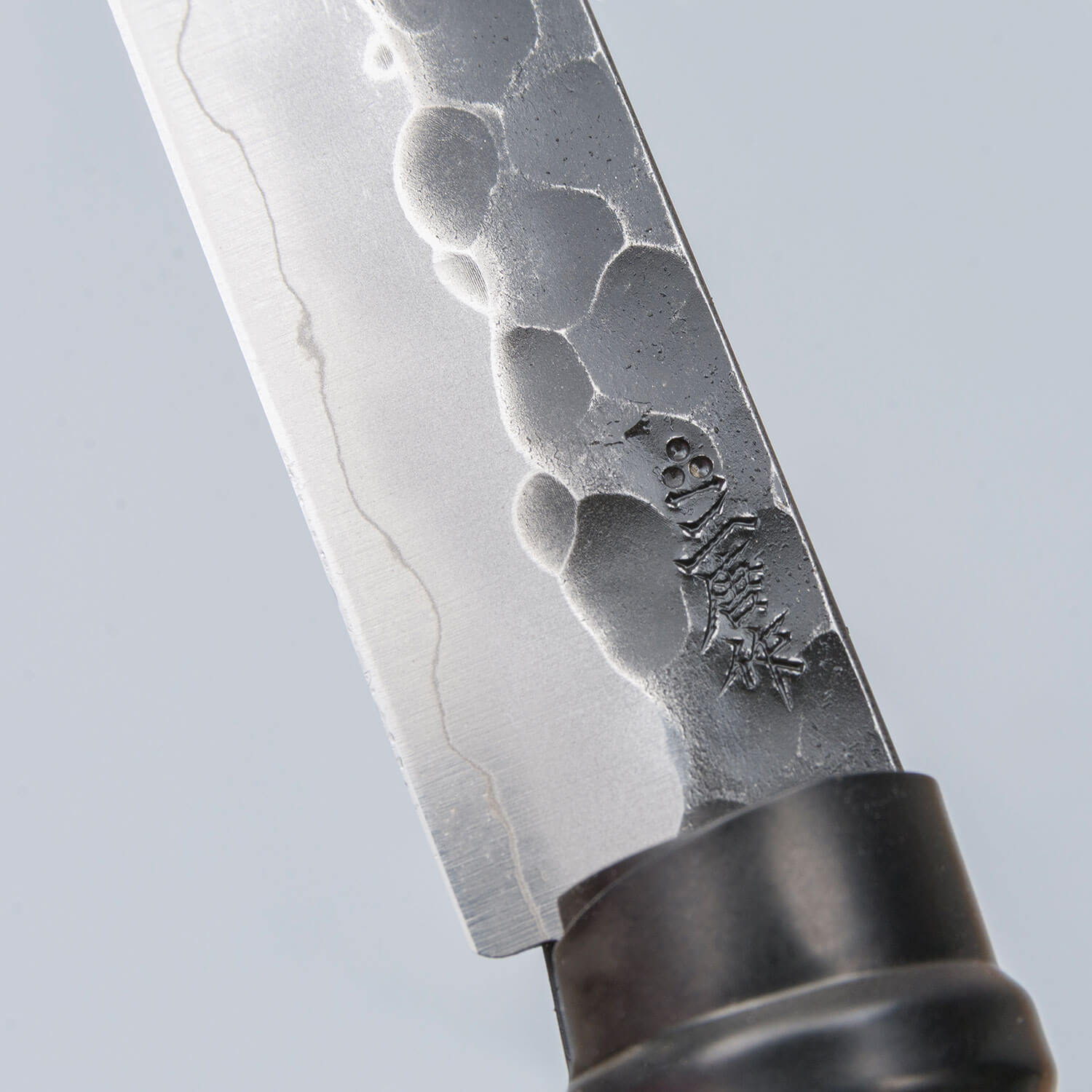 Het lemmet van dit bijzondere mes is gemaakt van meerlaags roestvrij staal (VG7). Het ambachtelijke hameren (bekend als Tsuchime) geeft het een onregelmatig oppervlak dat voorkomt dat nat voedsel aan het lemmet blijft plakken. Het mes heeft een opmerkelijke snit en een snijvlak dat lang meegaat.