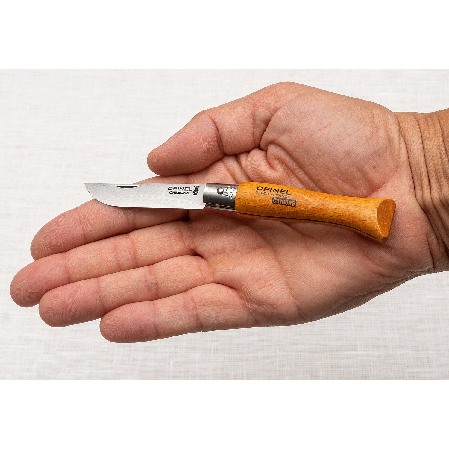 Het klassieke Opinel nr 5 zakmes met carbon staal. Deze staalsoort roest maar blijft veel langer scherp dan normaal roestvrij staal. Dankzij het supercompacte design kun je dit mesje altijd bij je dragen