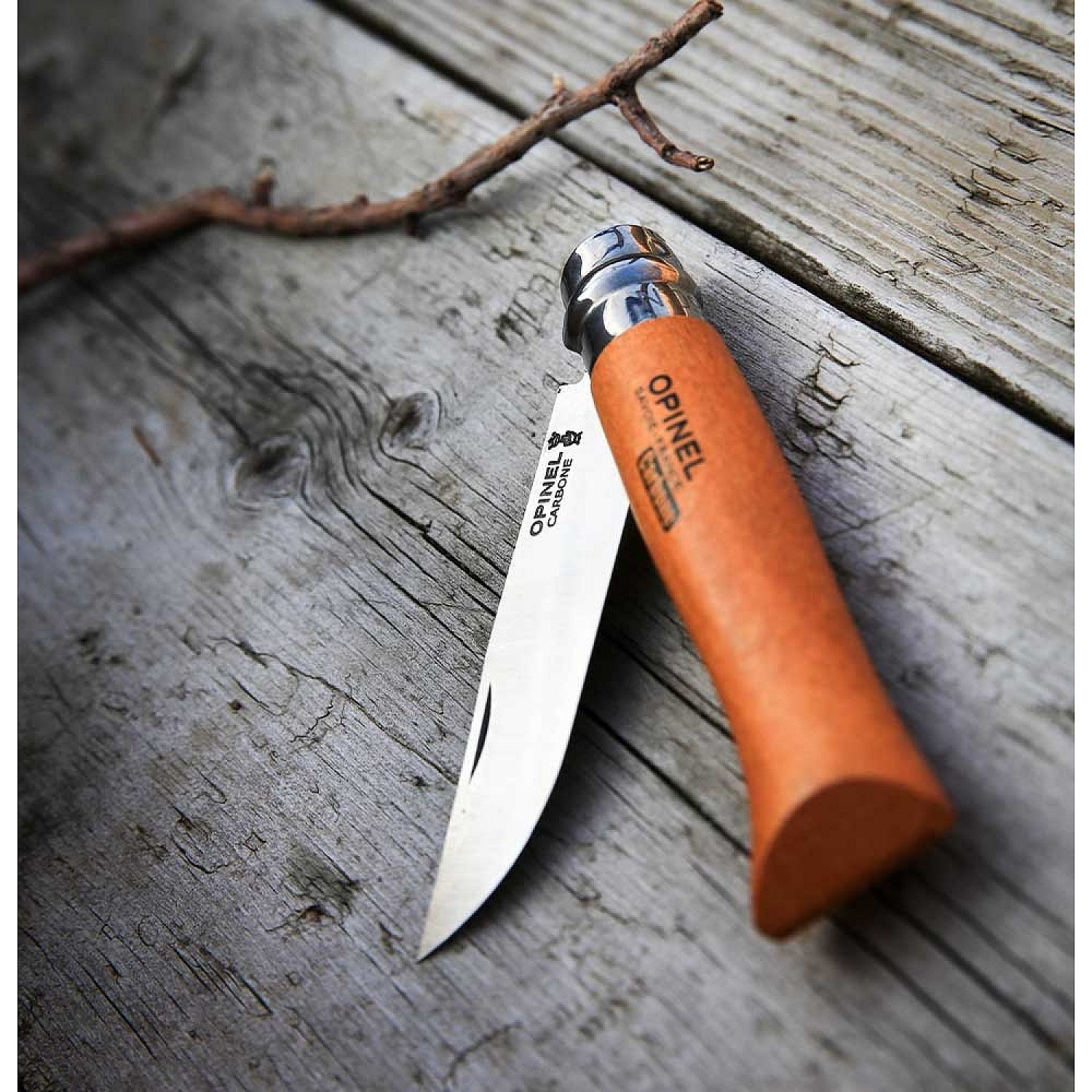 Het klassieke Opinel nr 9 zakmes met carbon staal. Deze staalsoort roest maar blijft veel langer scherp dan normaal roestvrij staal.