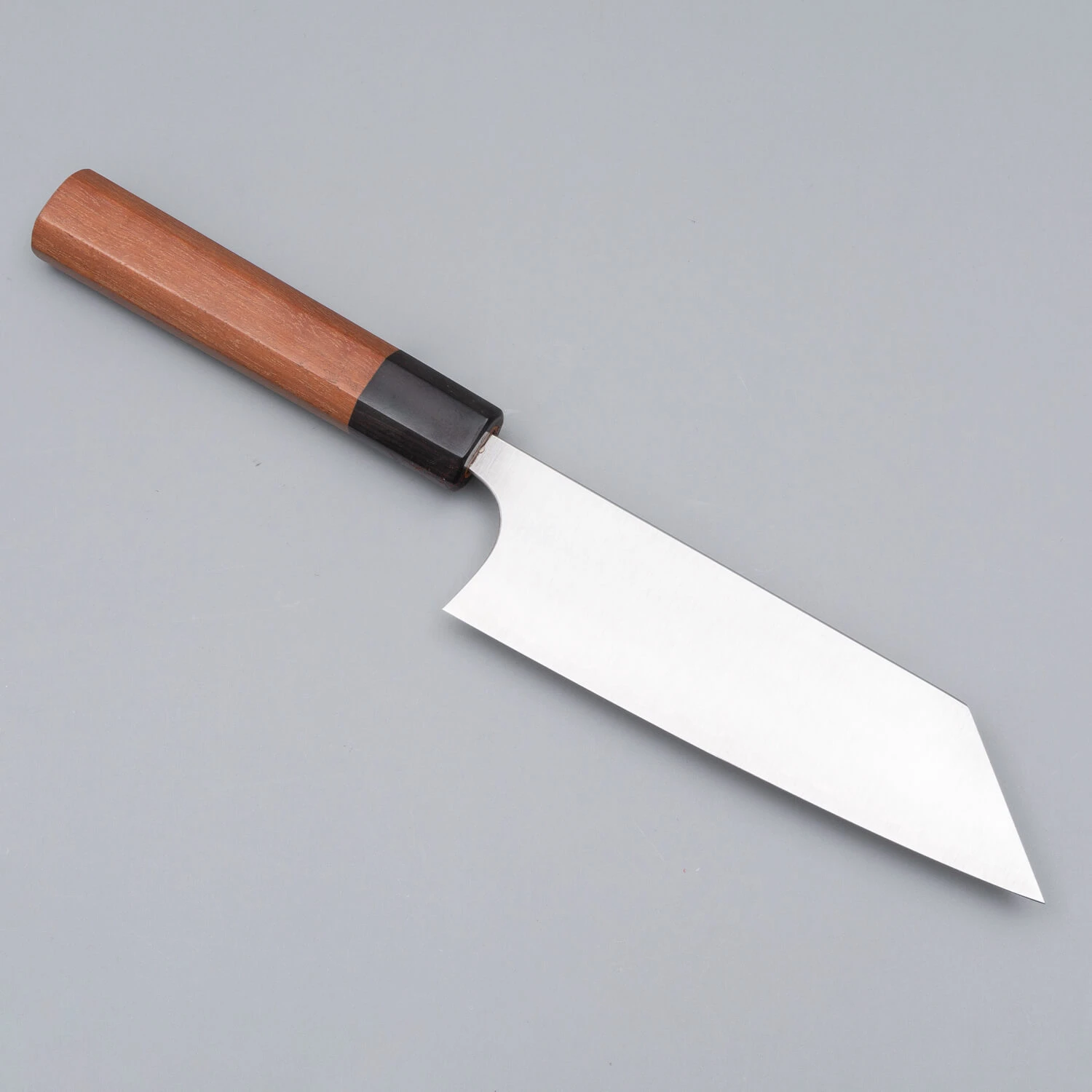 Het handvat is gemaakt van rozenhout en in een octagon gevormd (achthoek). Het stuk tussen het handvat en het lemmet is gemaakt van pakkahout wat beter is bestand tegen vocht. Wat opvalt is dat het handvat veel lichter is dan Japanse messen met een Western handvat.