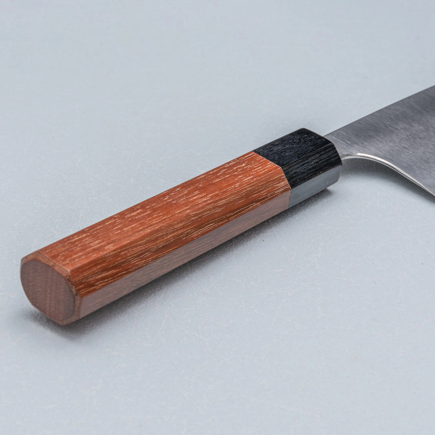 Het handvat is gemaakt van rozenhout en in een octagon gevormd (achthoek). Het stuk tussen het handvat en het lemmet is gemaakt van pakkahout wat beter is bestand tegen vocht. Wat opvalt is dat het handvat veel lichter is dan Japanse messen met een Western handvat.