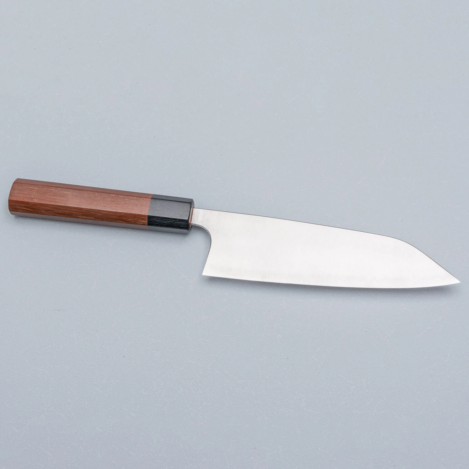 Het lemmet is gemaakt van Aogami 2 staal met een hardheid van 62-63 rockwell. Om de harde kernlaag te beschermen zijn er 2 lagen zachter staal om de harde kern gesmeed. Deze staalsoort is roestgevoelig en zal na verloop van tijd een patina laag krijgen.