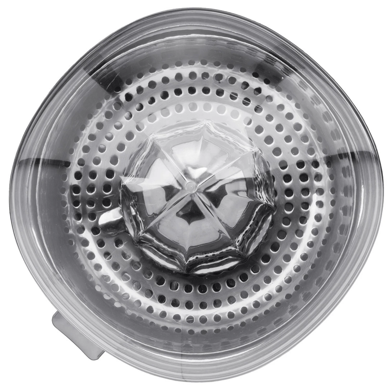 Deze citruspers is ontworpen met duurzame materialen zoals gegoten aluminium, roestvrij staal en Tritan. De perskegel en het pulpfilter zijn van RVS gemaakt, zodat het apparaat jarenlang meegaat en intensief gebruik geen probleem is. De antislip voetjes zorgen ervoor dat de citruspers stevig blijft staan, zelfs wanneer je wat harder drukt op het fruit. De deksel beschermt de pers wanneer hij niet wordt gebruikt, en kan tussendoor dienen als bakje voor schillen of halve sinaasappels.