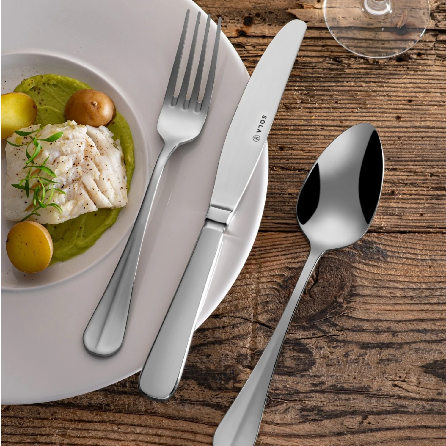 Hollands Glad is een echte klassieker binnen de Sola-collectie en al decennia geliefd om zijn tijdloze vorm en rustige uitstraling. Het ontwerp is elegant zonder overdaad, waardoor dit bestek moeiteloos past bij zowel een modern interieur als een traditionele gedekte tafel. Het subtiele lijnenspel en de herkenbare Baguette-vorm geven elke maaltijd een stijlvolle uitstraling, van een dagelijkse lunch tot een uitgebreid diner.
