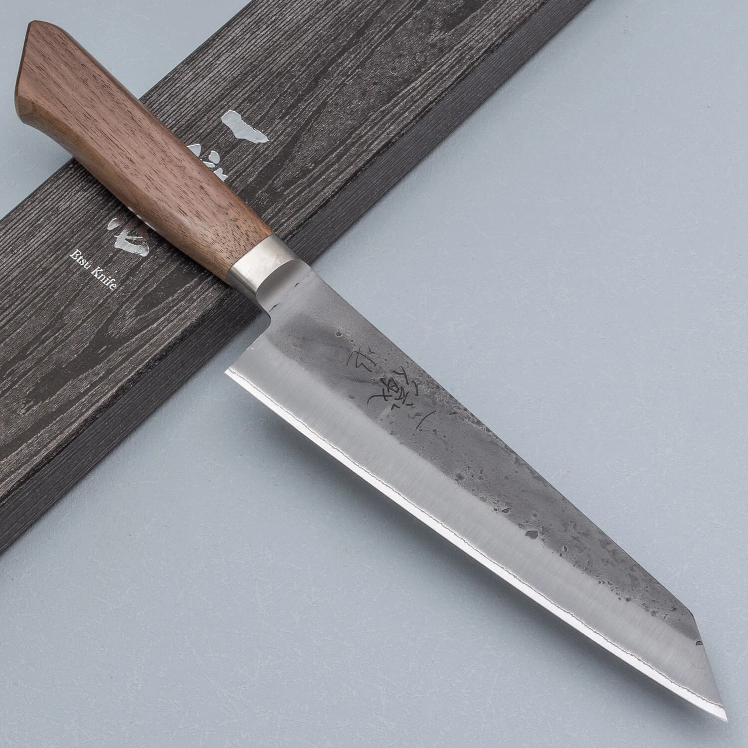 Het staal is gemaakt van Aogami #2 Blue paper staal. Dit is een carbon staal waar Japanse smeden graag mee werken. Het is hard, blijft lang scherp en is makkelijk te slijpen. Het kan alleen wel roesten en zal verkleuren met gebruik. Dit is een nadeel maar deze messen snijden en slijpen veel fijner dat roestvaste messen.