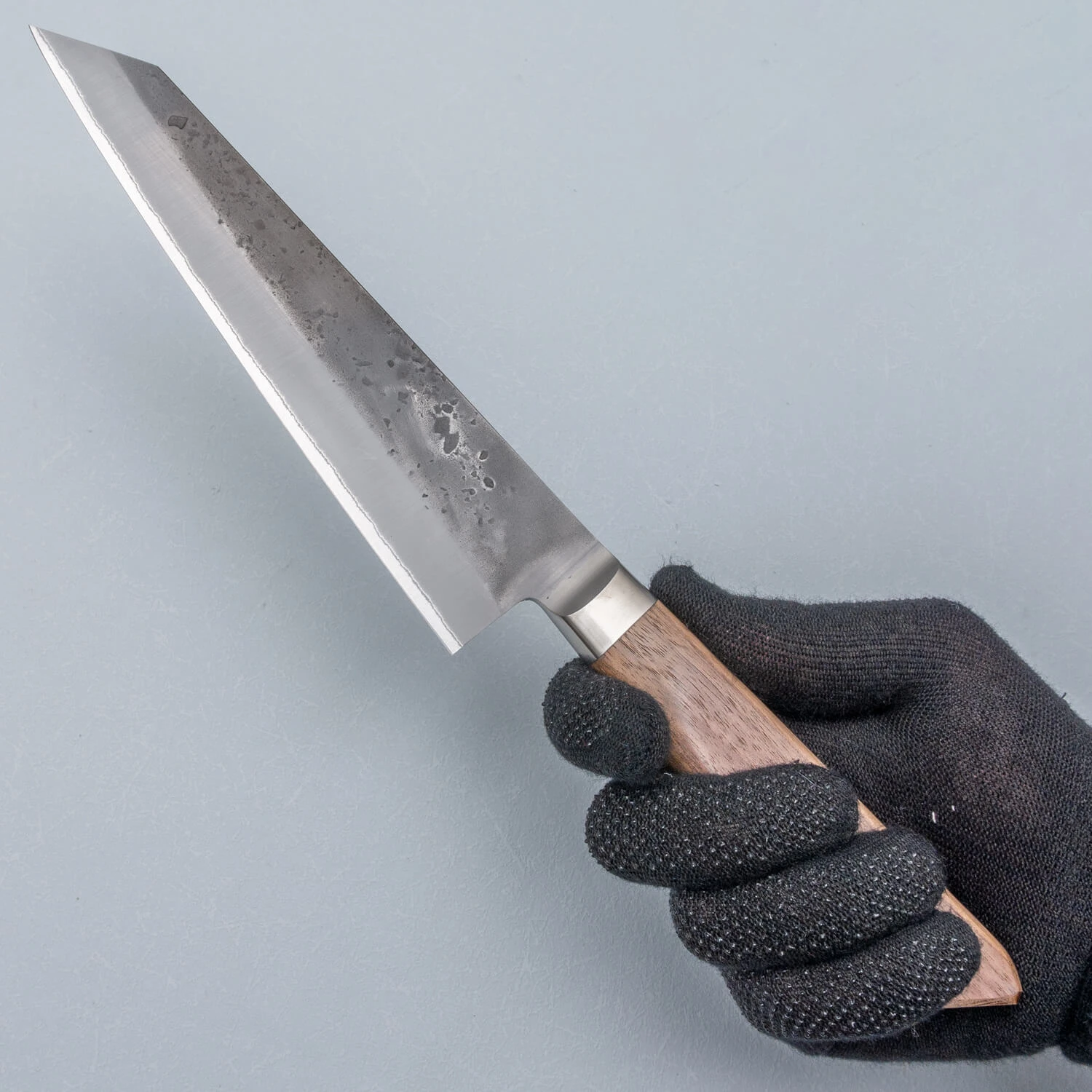 De SN serie van Tadafusa valt op door zijn ruige afwerking. Het lemmet heeft een Nashiji finish (Japans woord voor de huid van een peer) dat ongepolijst is. Dit geeft het mes een bijzonder design, helemaal in combinatie met het Bubinga houten handvat.