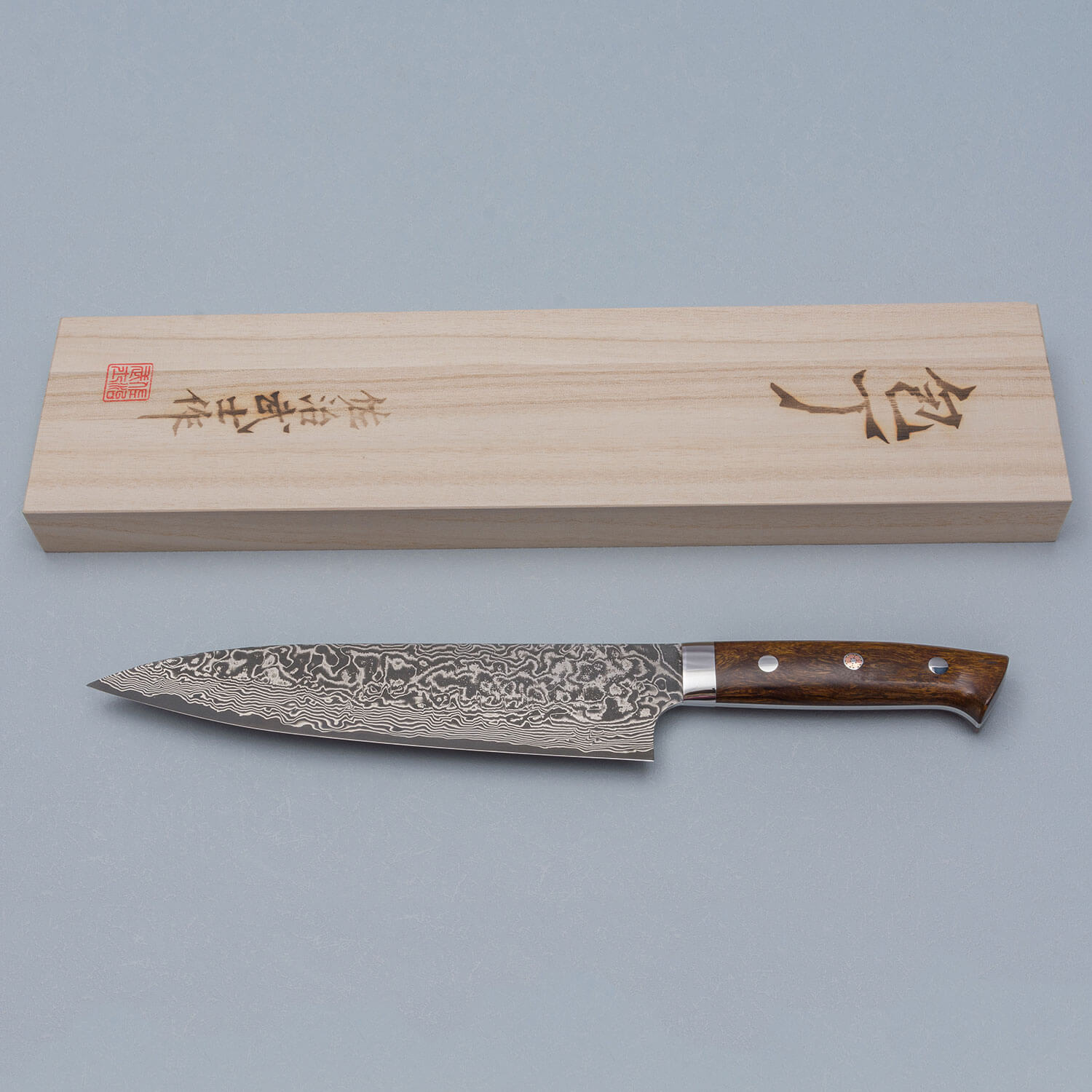 Een prachtige serie van Meestersmid Takeshi Saji. De messen vallen vooral op door de donkere damast lagen. De lagen zijn na het smeden extra zichtbaar gemaakt door het plaatsen in een zuurbad. Hierna is het mes geslepen en afgewerkt met dezelfde kwaliteit als we van Takeshi Saji gewend zijn.