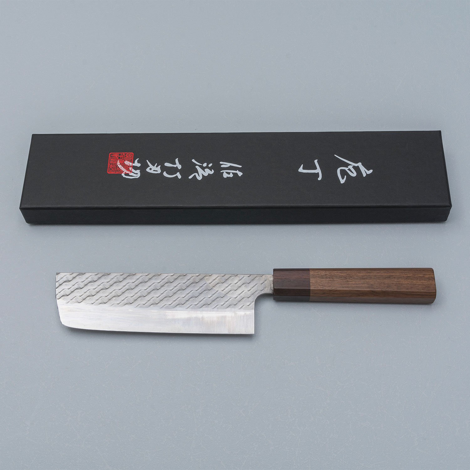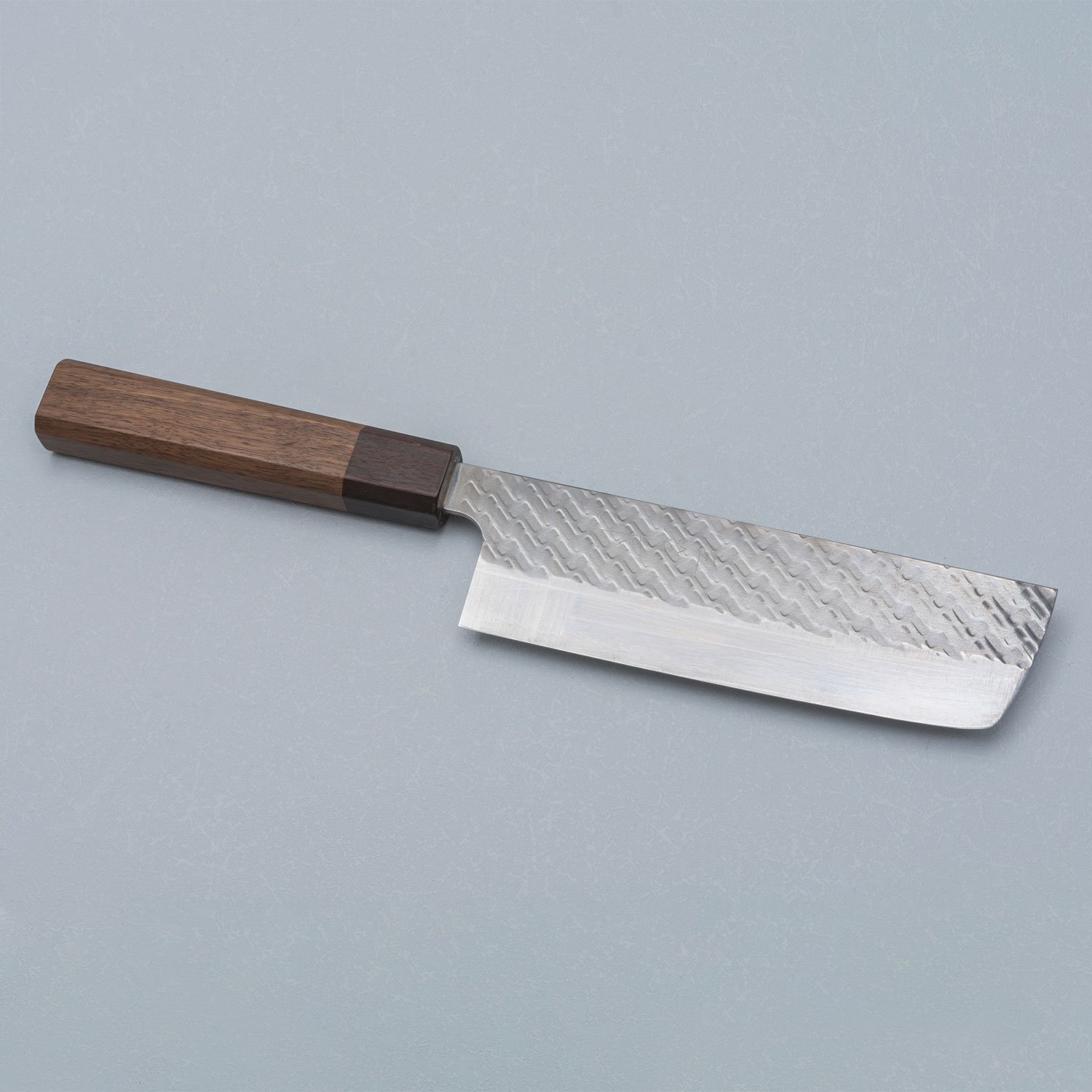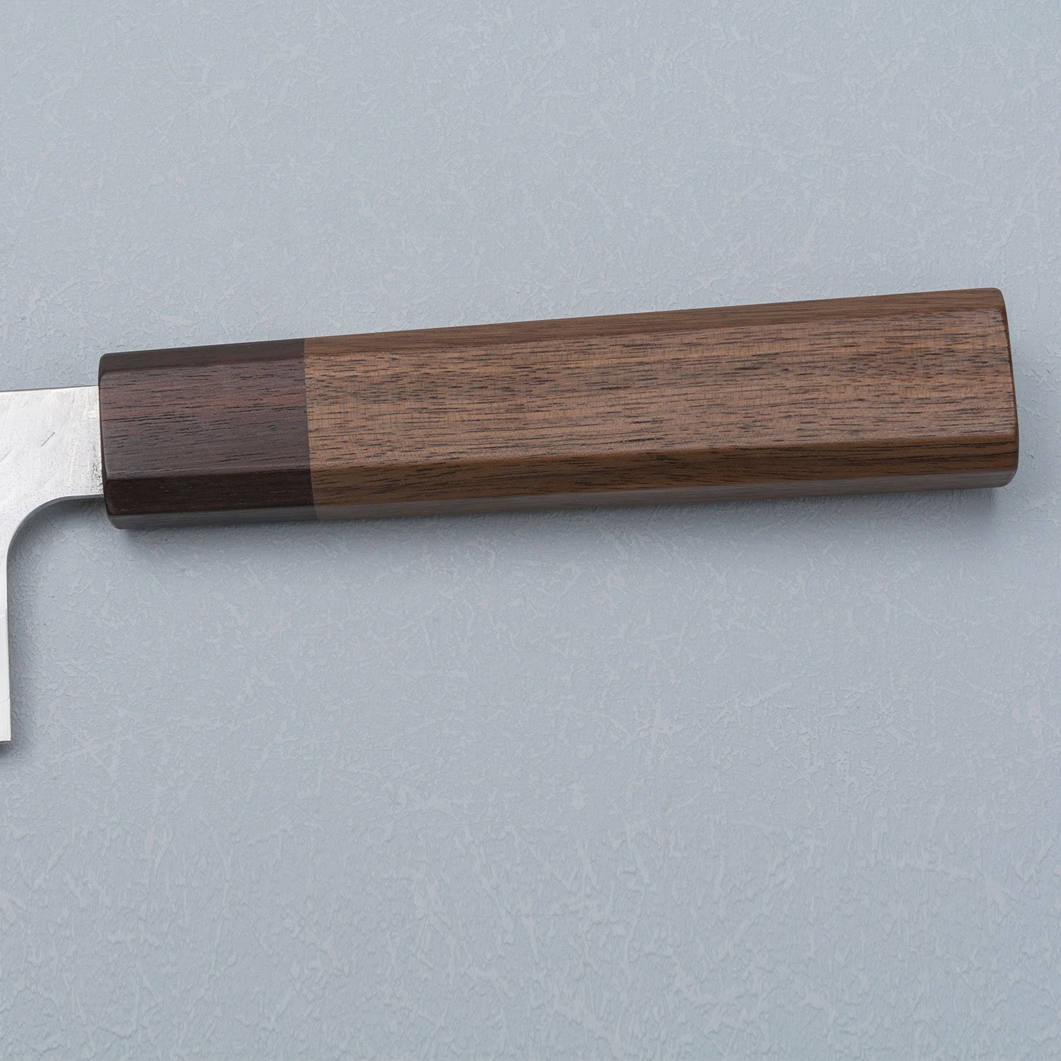 De nieuwe serie van Takeshi Saji die gemaakt is van SPG Strix Staal! Deze poedermetaal kun je zien als een geoptimaliseerde versie van SG2. Het staal is harder maar toch goed te slijpen. Daarbij is het volledig roestvast, zelfs bij het snijden van zure ingrediënten. Het mes heeft een indrukwekkende Tsuchime patroon en voelt solide aan. Het achthoekige (octagon) handvat is gemaakt van walnoothout.
