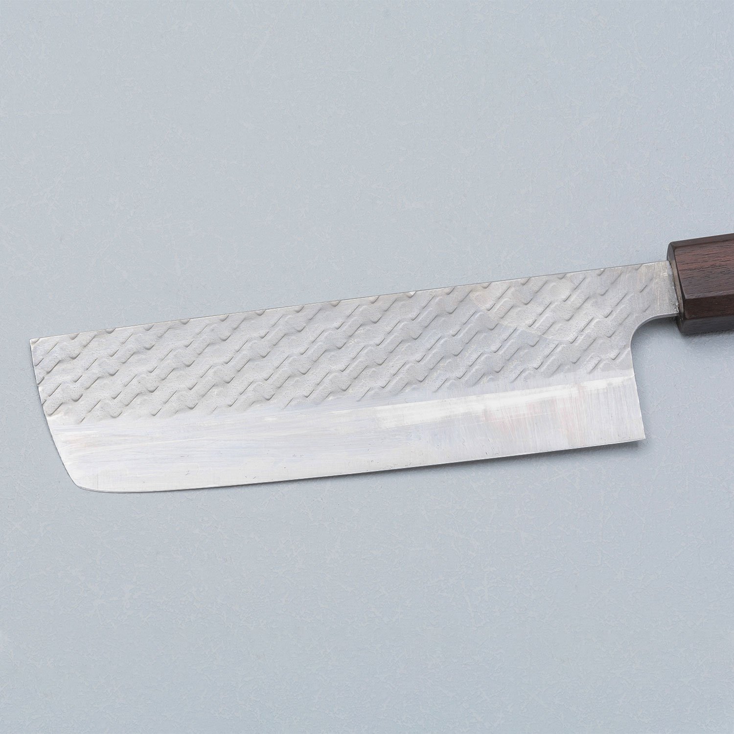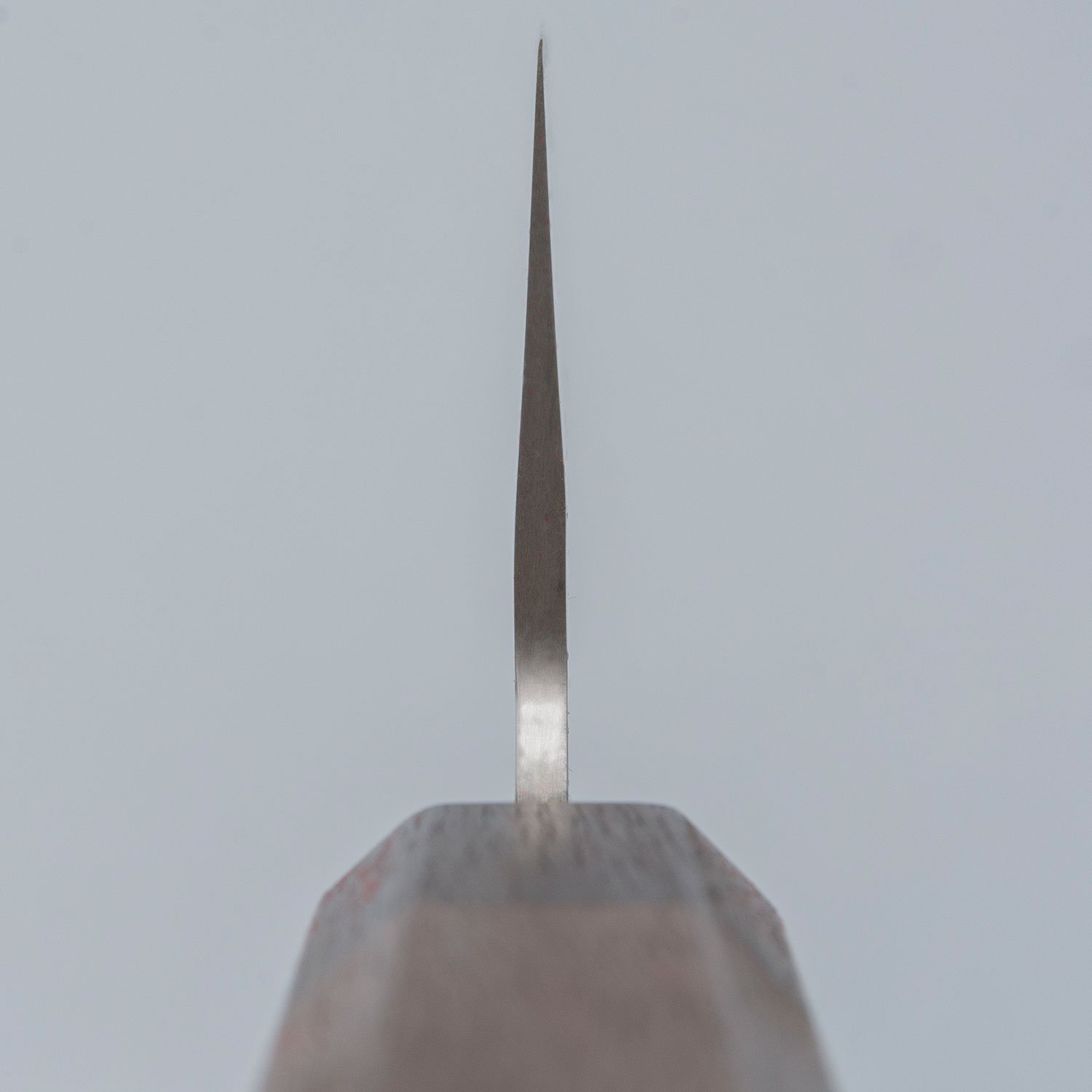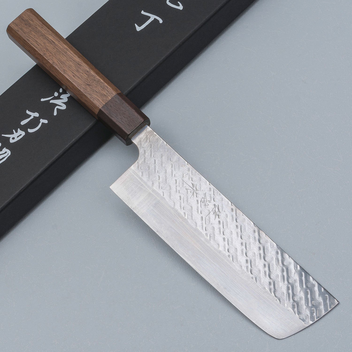 De nieuwe serie van Takeshi Saji die gemaakt is van SPG Strix Staal! Deze poedermetaal kun je zien als een geoptimaliseerde versie van SG2. Het staal is harder maar toch goed te slijpen. Daarbij is het volledig roestvast, zelfs bij het snijden van zure ingrediënten. Het mes heeft een indrukwekkende Tsuchime patroon en voelt solide aan. Het achthoekige (octagon) handvat is gemaakt van walnoothout.