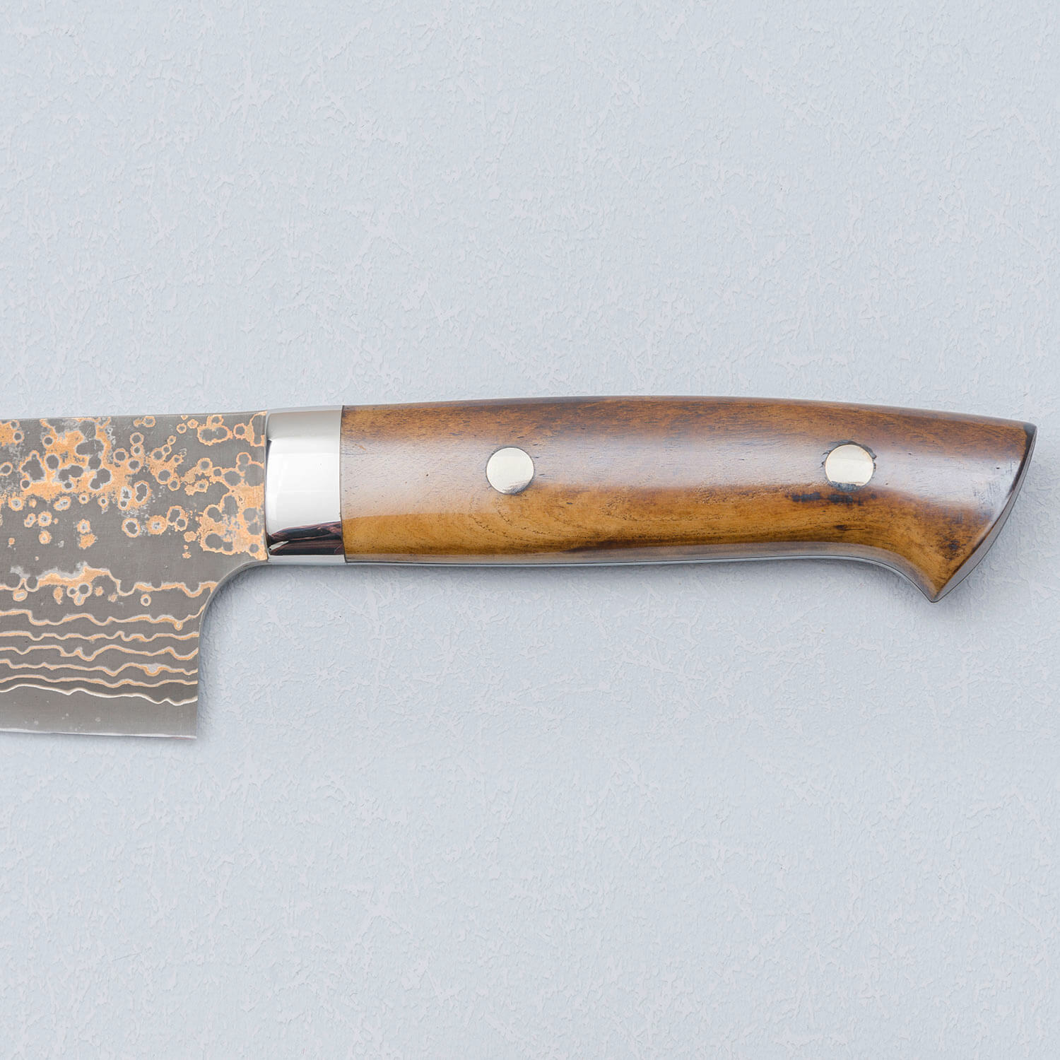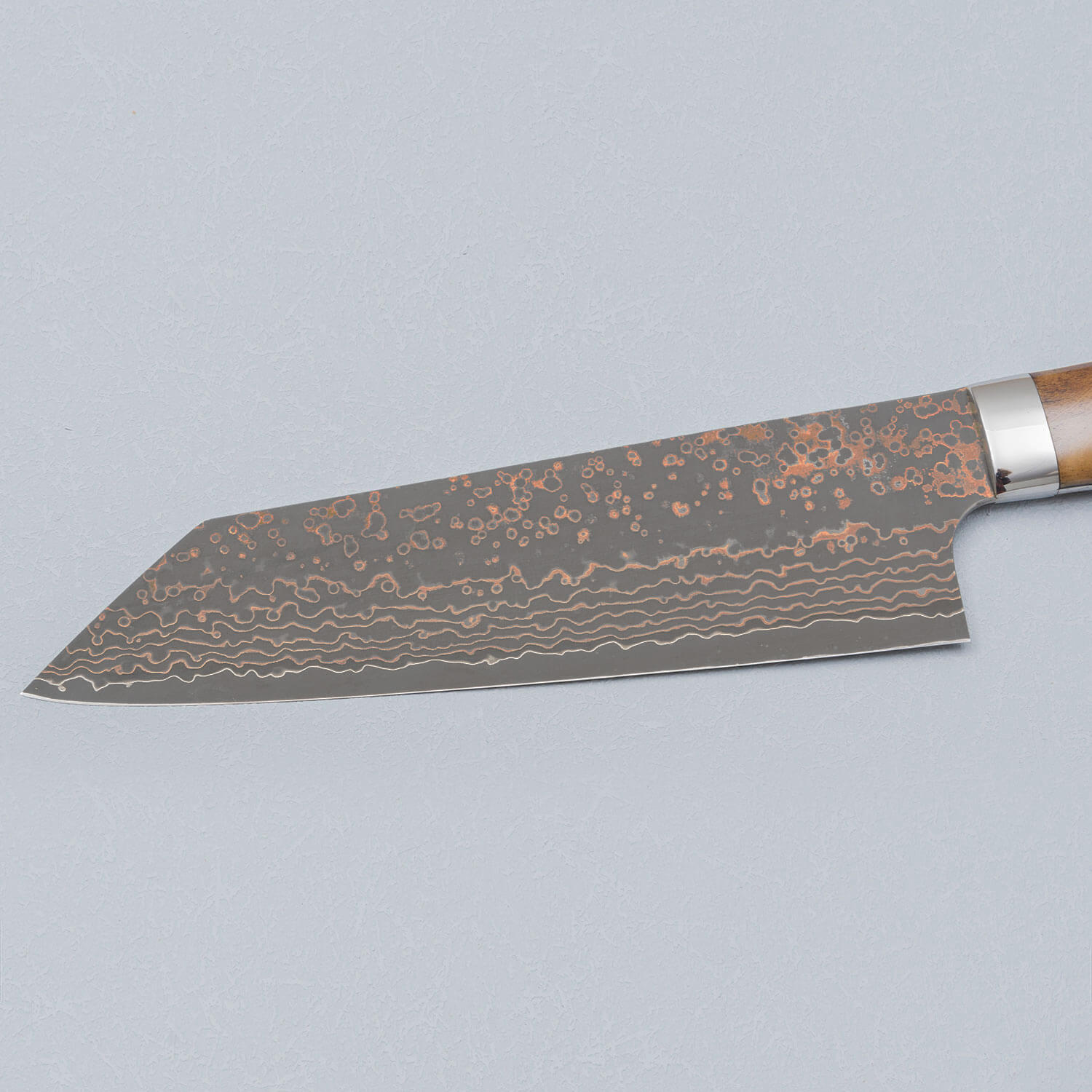 Het mes is gemaakt van Rainbow VG10 staal. Dit is een roestvrij staalsoort dat lang scherp blijft en een uniek ontwerp heeft door het toevoegen van koper en messing. Na het smeden is het staal geëtst met azijn om het zo nog specialer te maken. Een prachtig mes gemaakt door een van de beste smeden uit Echizen, Japan.