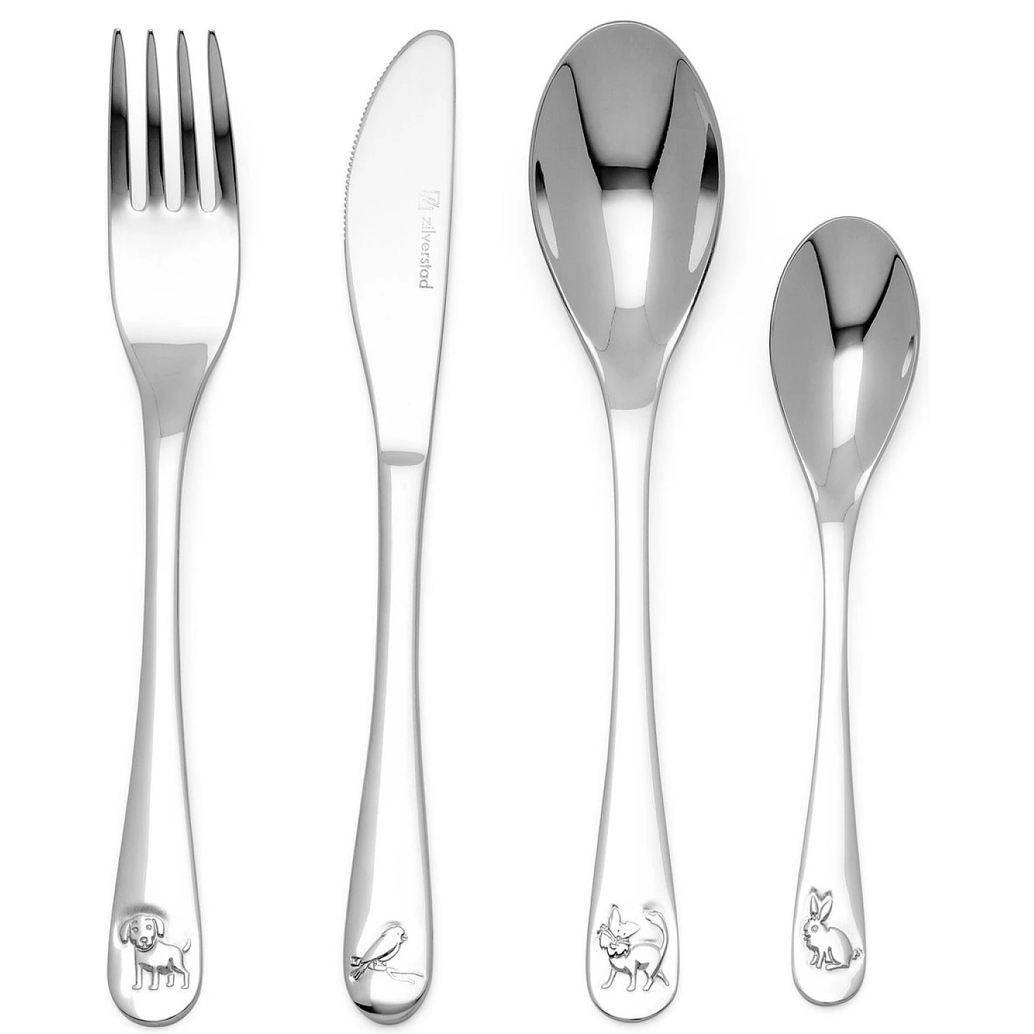 Eten is voor je kleintje het leukst met een eigen kinderbestek. En dan vooral met een bestek met leuke huisdieren erop. Zo staat er op de vork een hondje, een vogel op het mes, een kat op de grote lepel en op de kleine lepel een konijn.