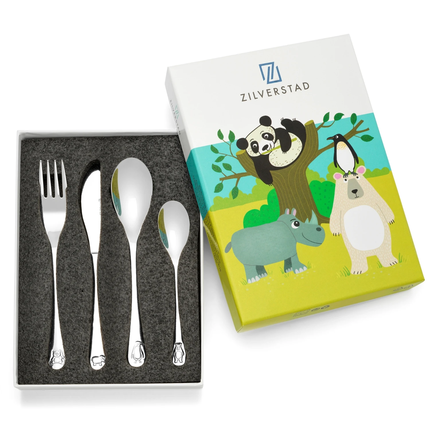 Dit Zilverstad kinderbestek is versierd met de leukste wilde dieren, en welk kind wordt daar niet blij van? Op het mes staat een schattig neushoorn, de vork heeft een vrolijke pandabeer, de grote lepel is versierd met een pinguïn en op het kleine lepeltje staat een schattig beertje. Dit vrolijke bestek zorgt zeker voor blije gezichten aan tafel!